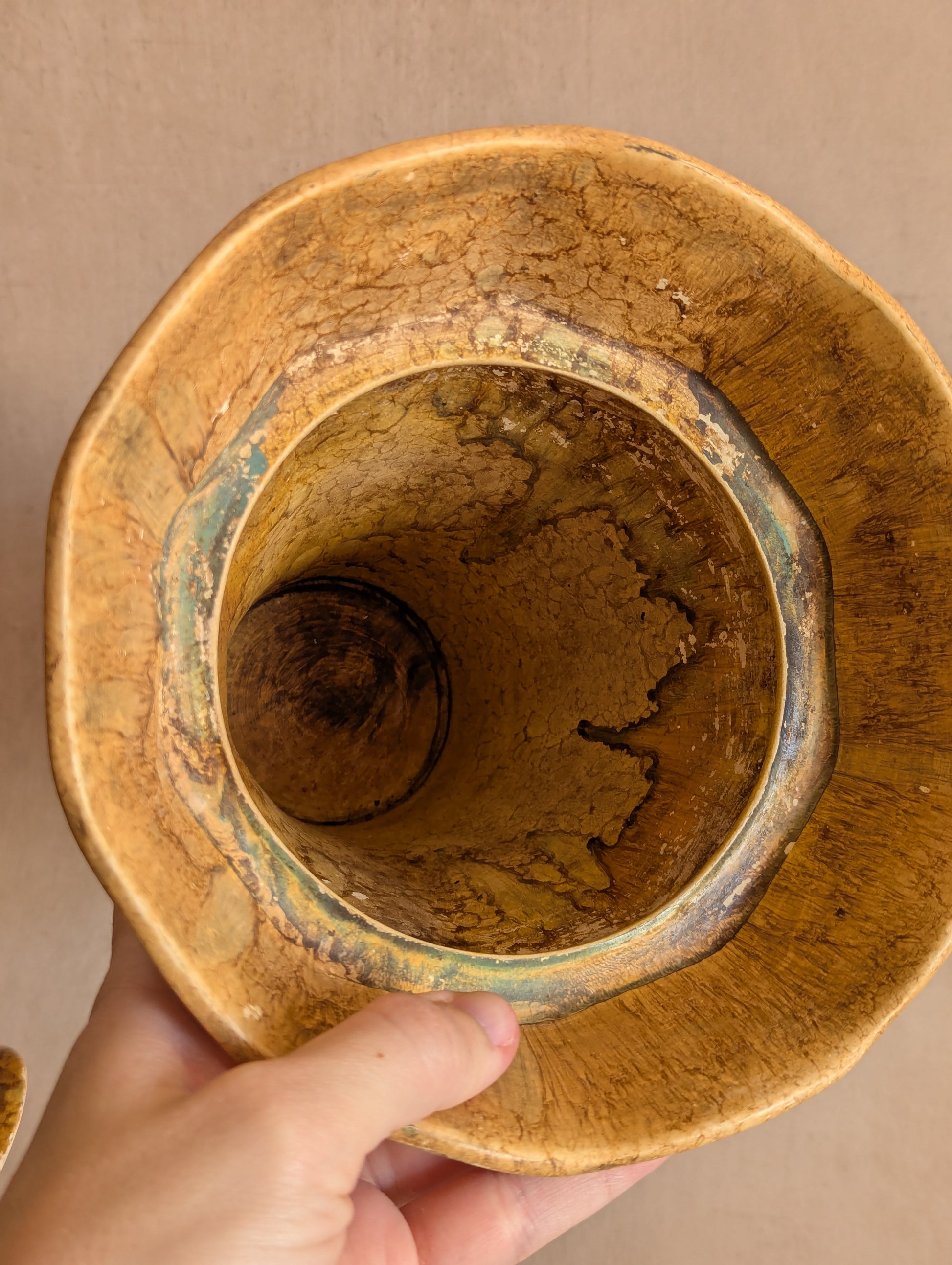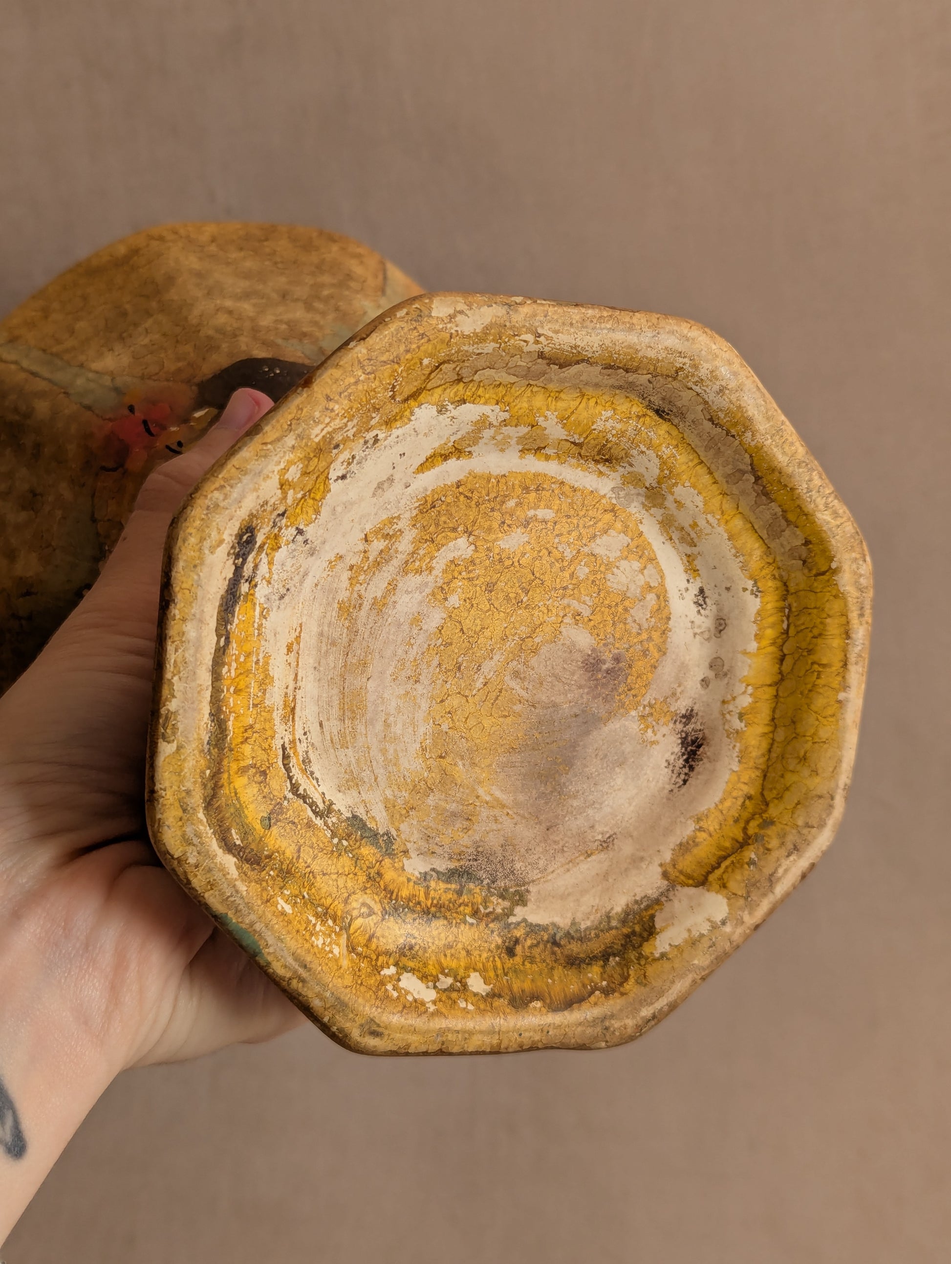 A beautifully weathered and unglazed art deco vase with frog insert. Lovely scalloped detailing at the top edge with a geometric octagonal base and walls. Chippy spray effect paint in natural colours including red, green, black, and dark tan. A very raw and organic piece. Antique c. 1920s/30s.