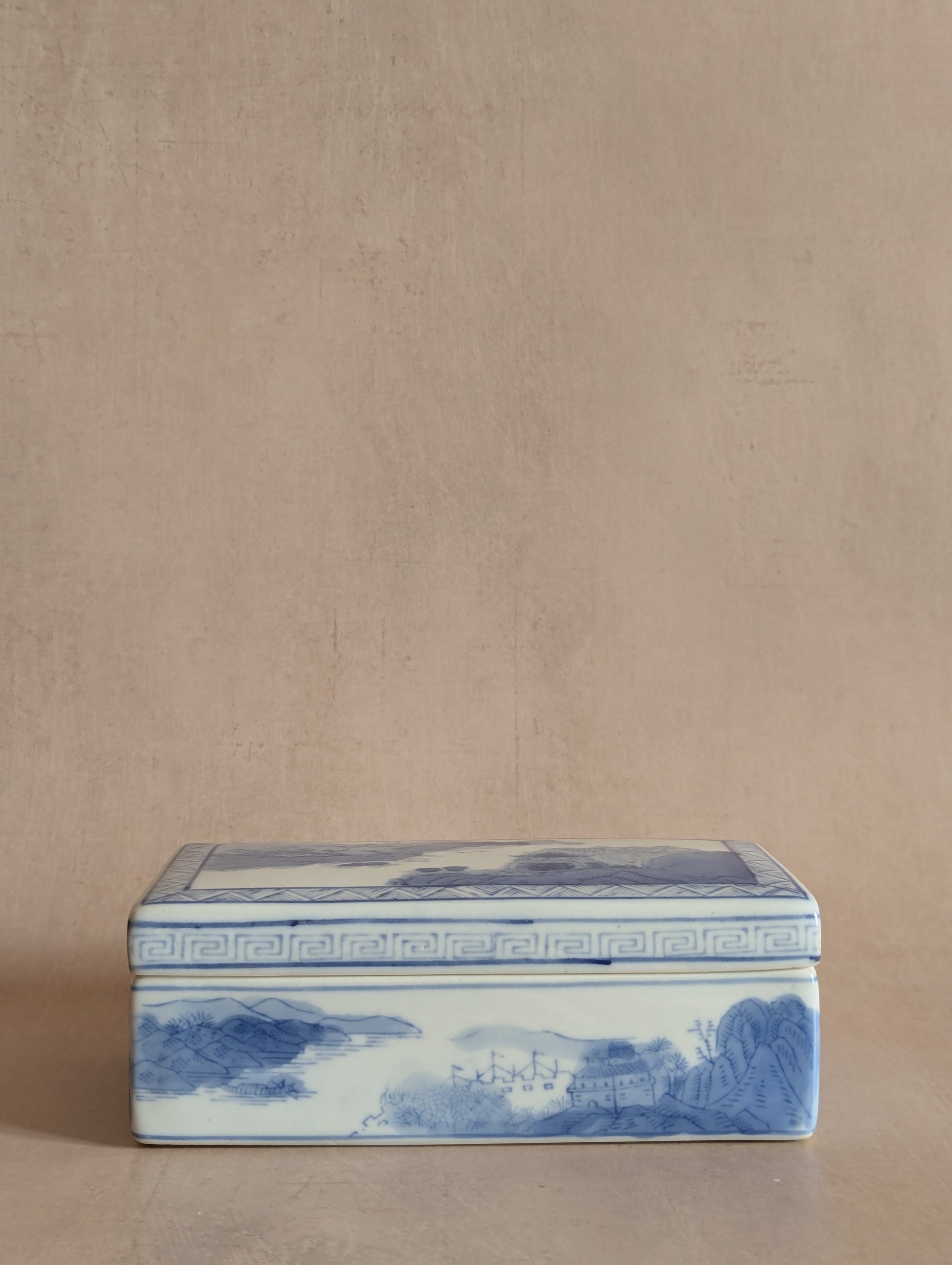 A perfectly gentle blue Chinese piece to add some character to your space. Perfect for bookshelves, coffee tables, or desks - perfect size for a TV remote. Marked on the underside of the lid. Antique c. early 20th century.