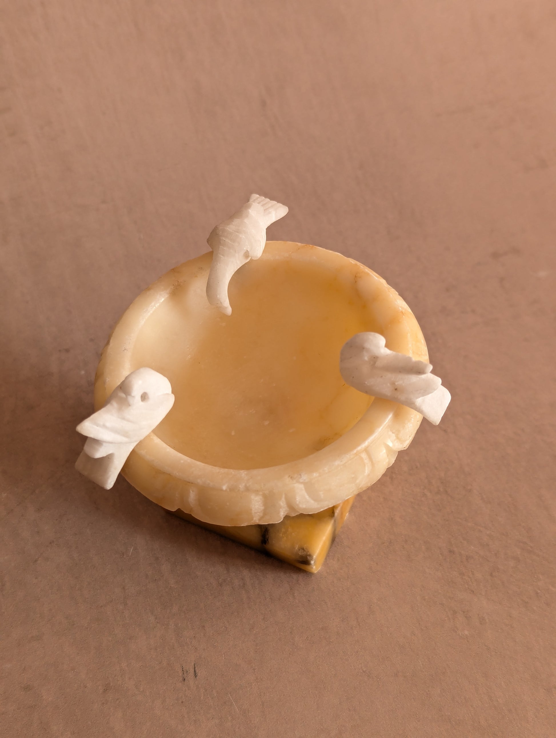 A fantastically tiny alabaster tazza with three hand-carved doves relaxing along the edge. Perfect for tiny trinkets or just to have on display. Italian, antique c. early 1900s.