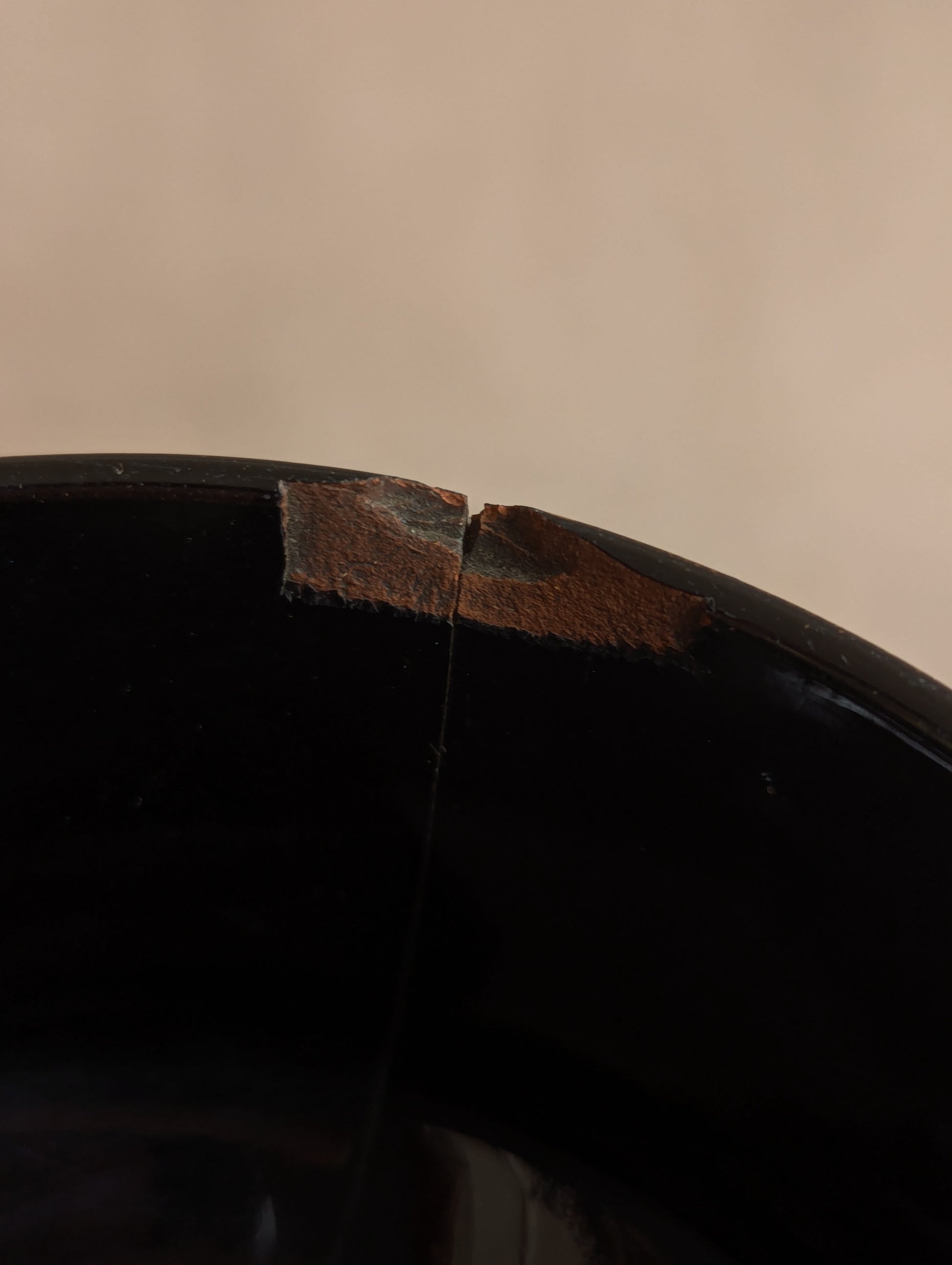 Signs of life include some slight wearing away of the hand-painted accents. There is also a large chip on the top edge leading into a long crack along the wall. This piece is ready to retire to a life of ease in a loving home.