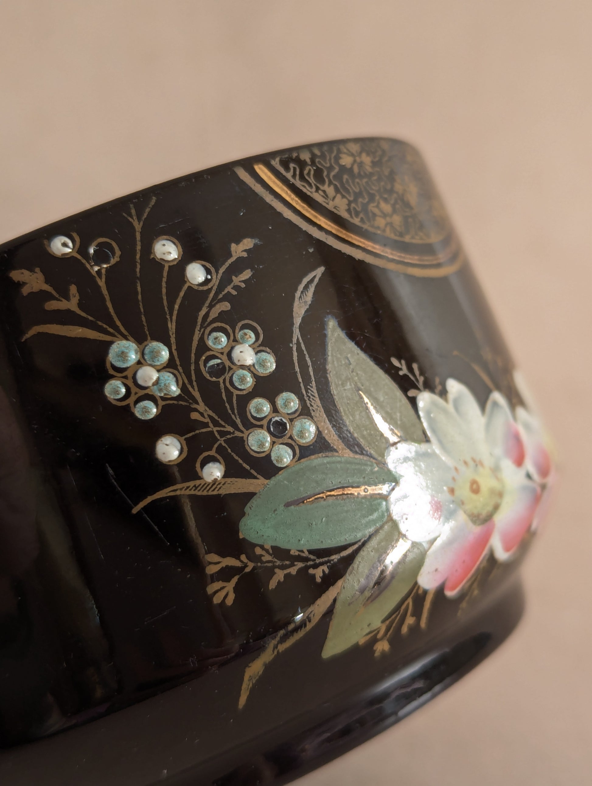 A gorgeous hand-painted floral bowl by Jackfield Pottery. An all-black earthenware piece with floral accents and gilt details. Would make a lovely dry planter or trinket dish. Marked "RdNo117962" on the bottom. Antique c. 1889.