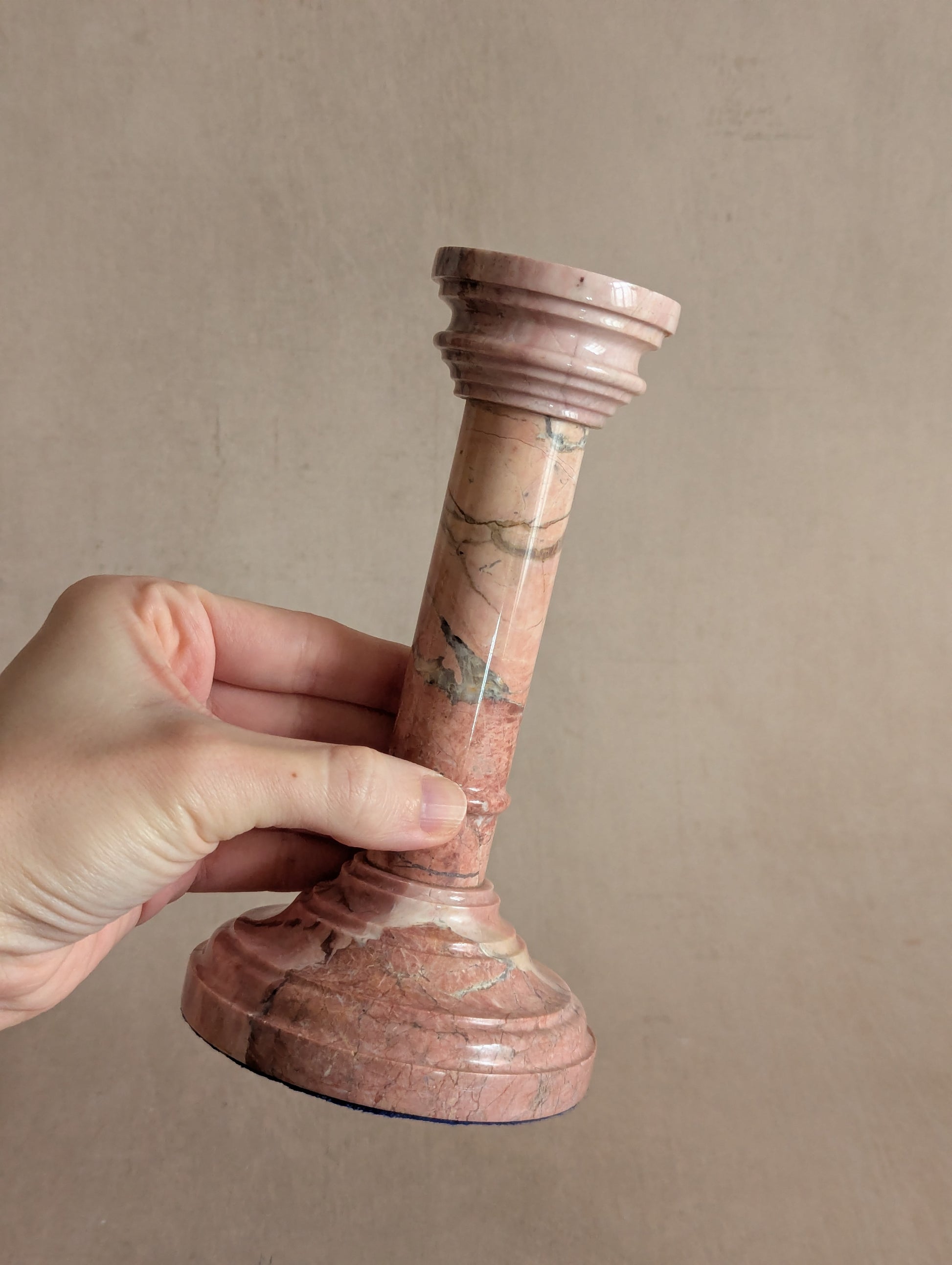 A beautiful pink stone candlestick holder. Features grey veining and a lovely column/pedestal shape. Antique c. early to mid 20th century. Top piece shifts ever so slightly but is still firmly attached; does not affect use. Measures almost 17.5cm tall and 9cm diameter at the base. Candle cup measures 20mm diameter.