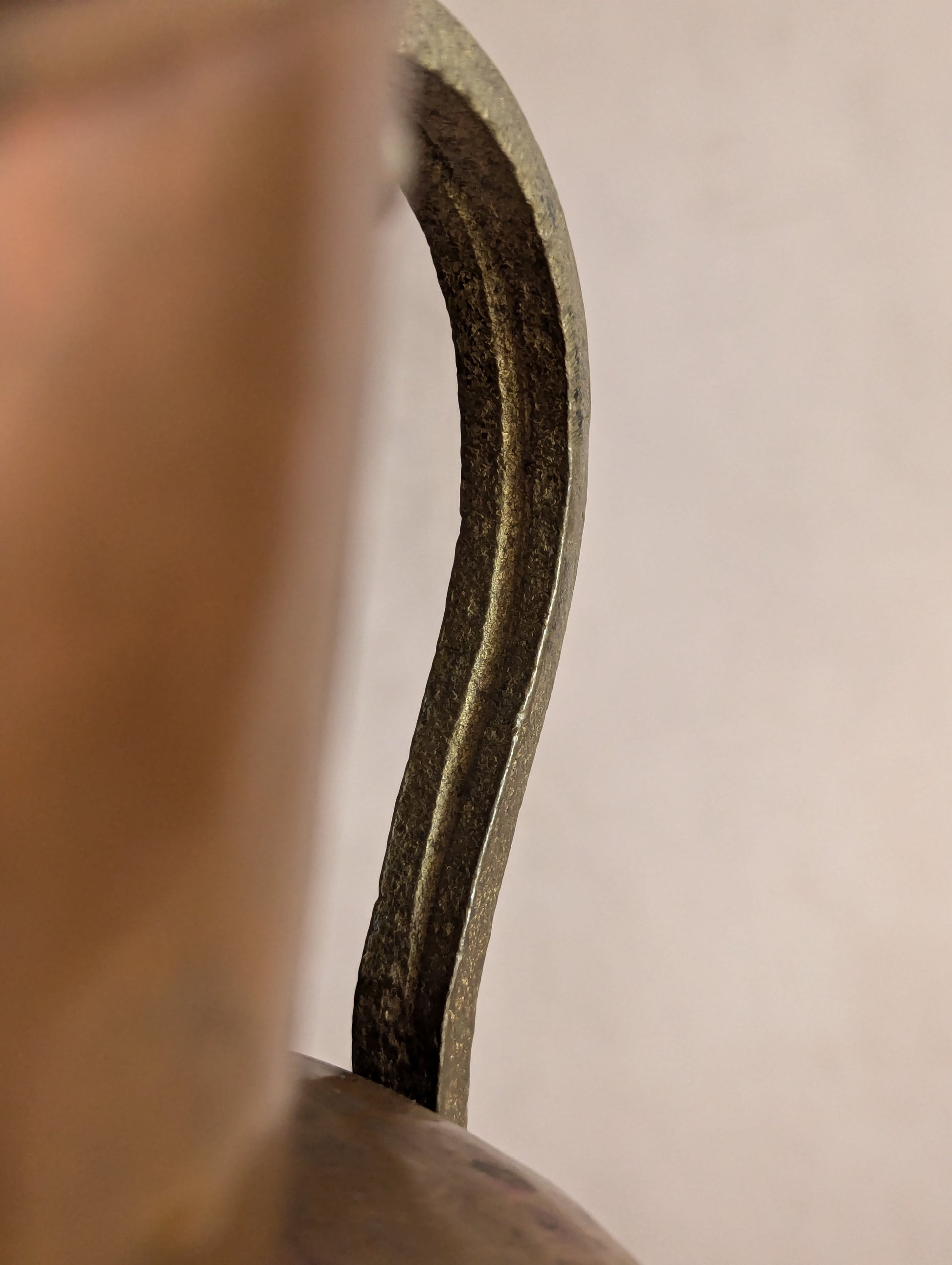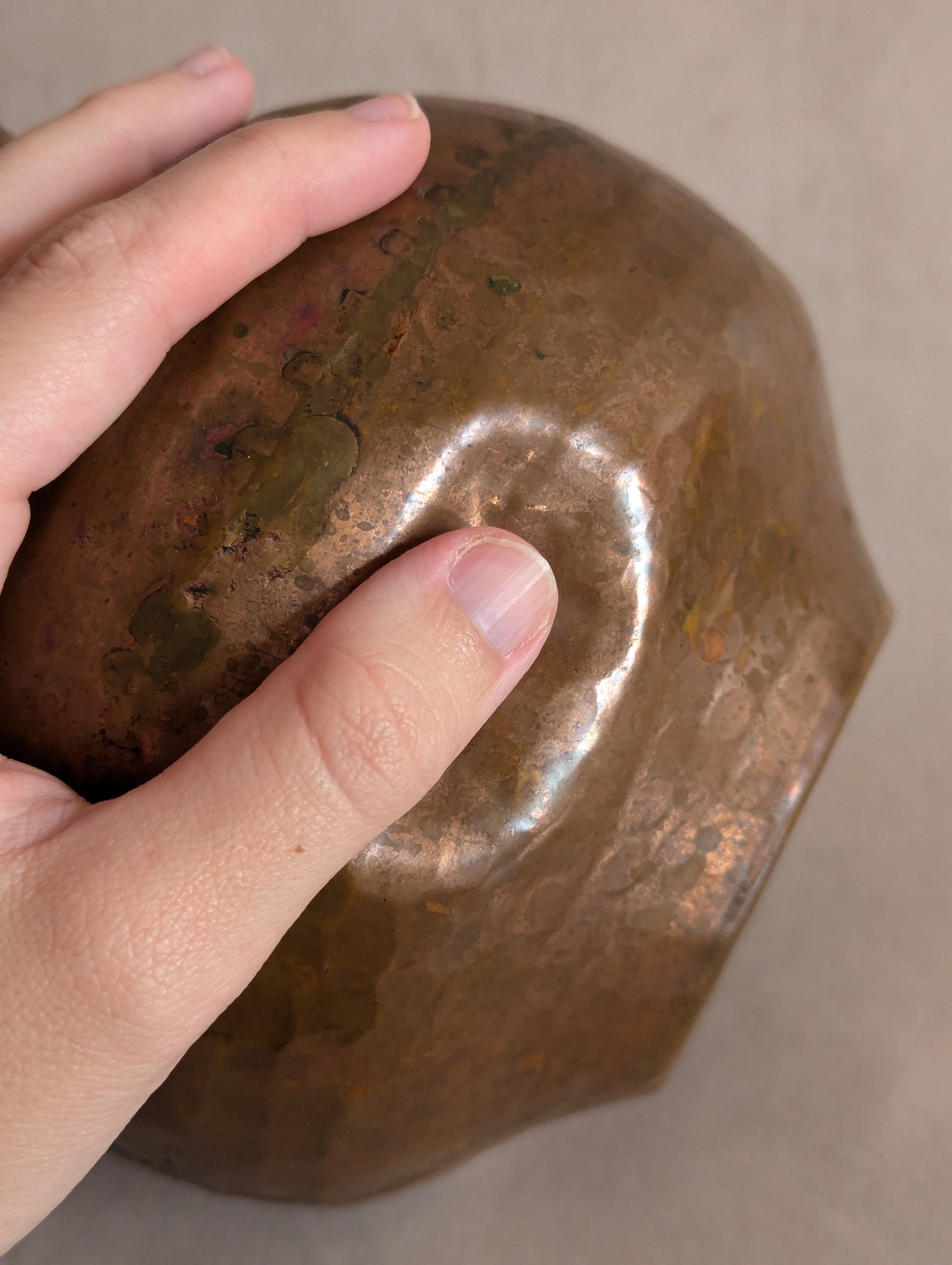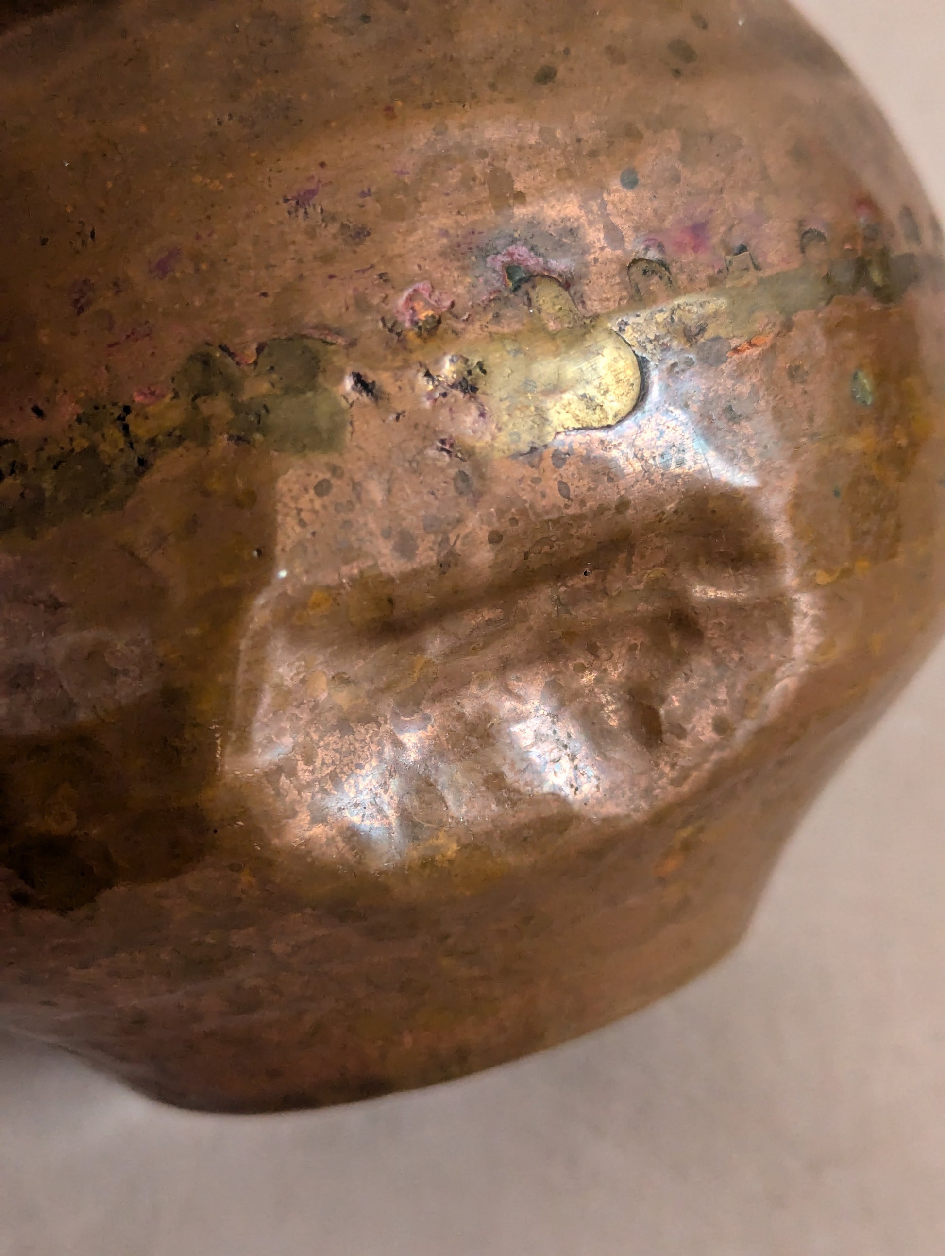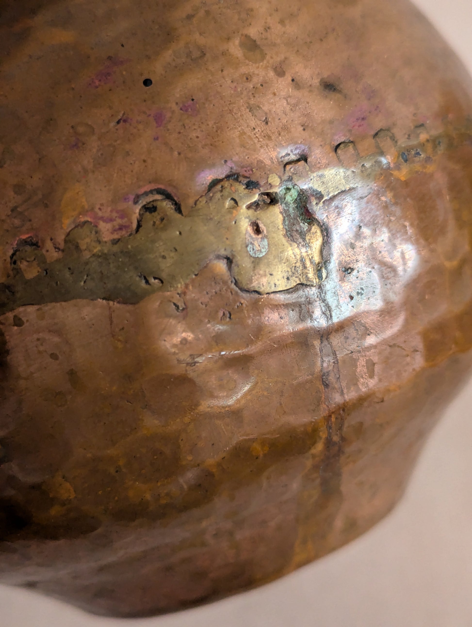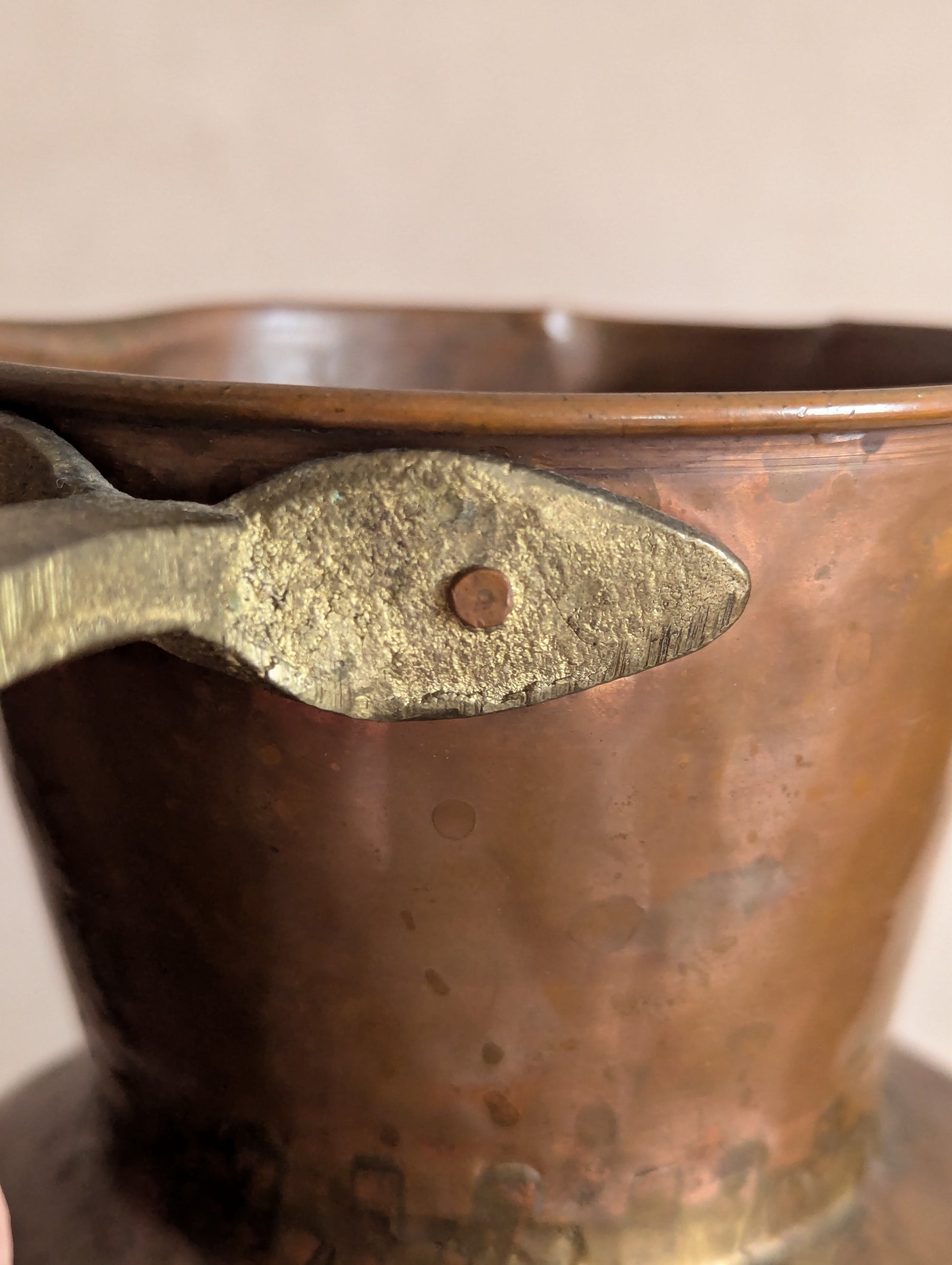 An incredibly stunning piece that would look tremendous in a French or rustic cottage kitchen. With castellated seams to seal up the piece, this was primitively made likely in the early to mid 19th century. With tremendous character and depth, this would be a wonderful piece to turn into a vase or centrepiece.
