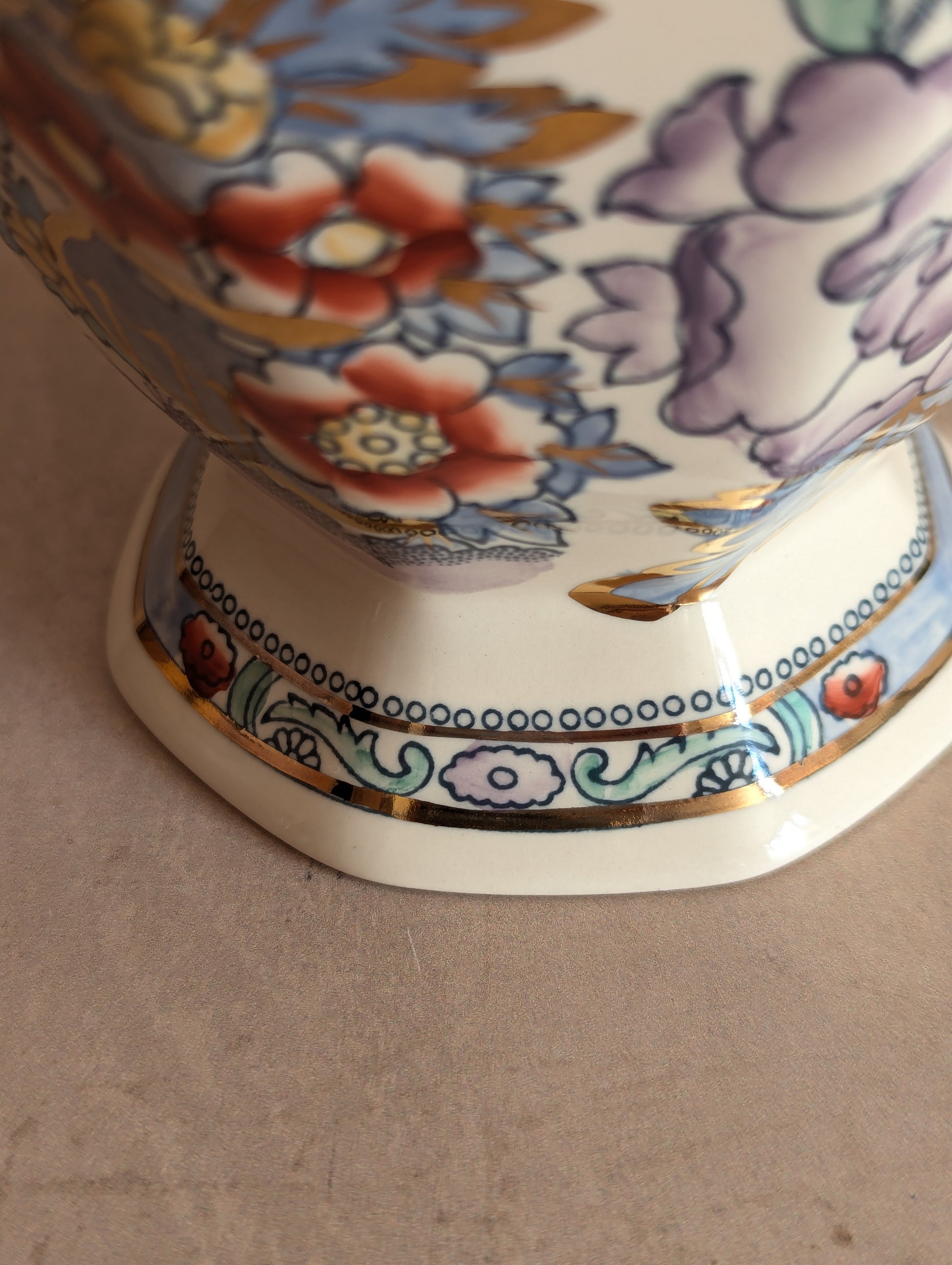A beautiful ceramic jar featuring a pastel floral motif with gold gilt accents. This is a genuine Mason's piece - the shape is the Tokyo Vase and the pattern is Blue Topaz. Marked on the underside. Vintage c. late 20th century.