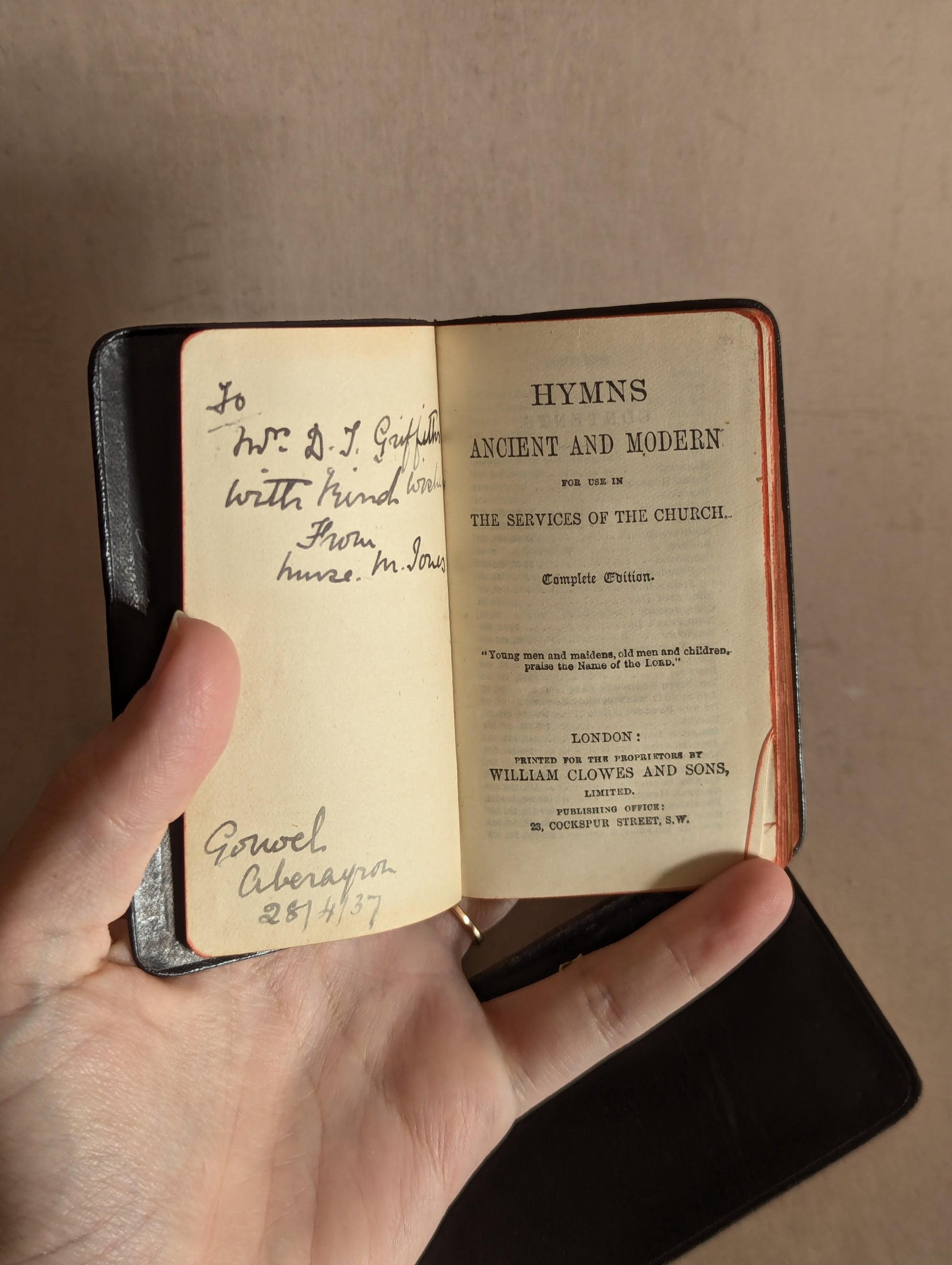 A beautiful set of miniature black leather worship books with their own matching carrying case. Includes The Book of Common Prayer and Hymns Ancient & Modern, both published in London. Interior page of the Hymn book is inscribed with the year 1937. This little set would be a perfect gift for collectors, believers, or anyone with a penchant for tiny little antiquities. Antique c. 1937.