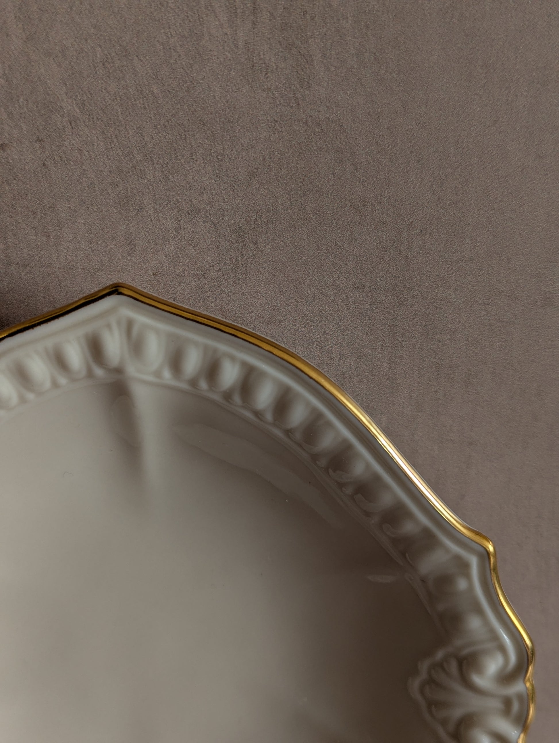 A gorgeous ceramic dish with shell-like accents and a gold gilt rim. Marked Lenox, made in America. Vintage c. 1980s-90s. Incredible condition, barely any signs of wear. Measures 15 x 16.5cm.