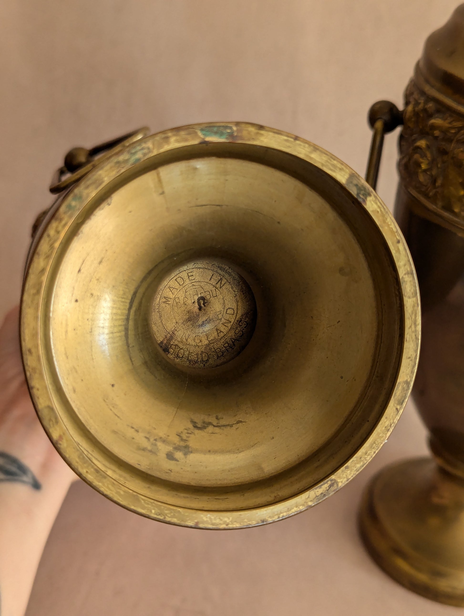 A dent here and there and typical patina for their age. No additional damage, confirmed watertight. Both stand sturdy but one has a slightly uneven base so it can shift slightly.