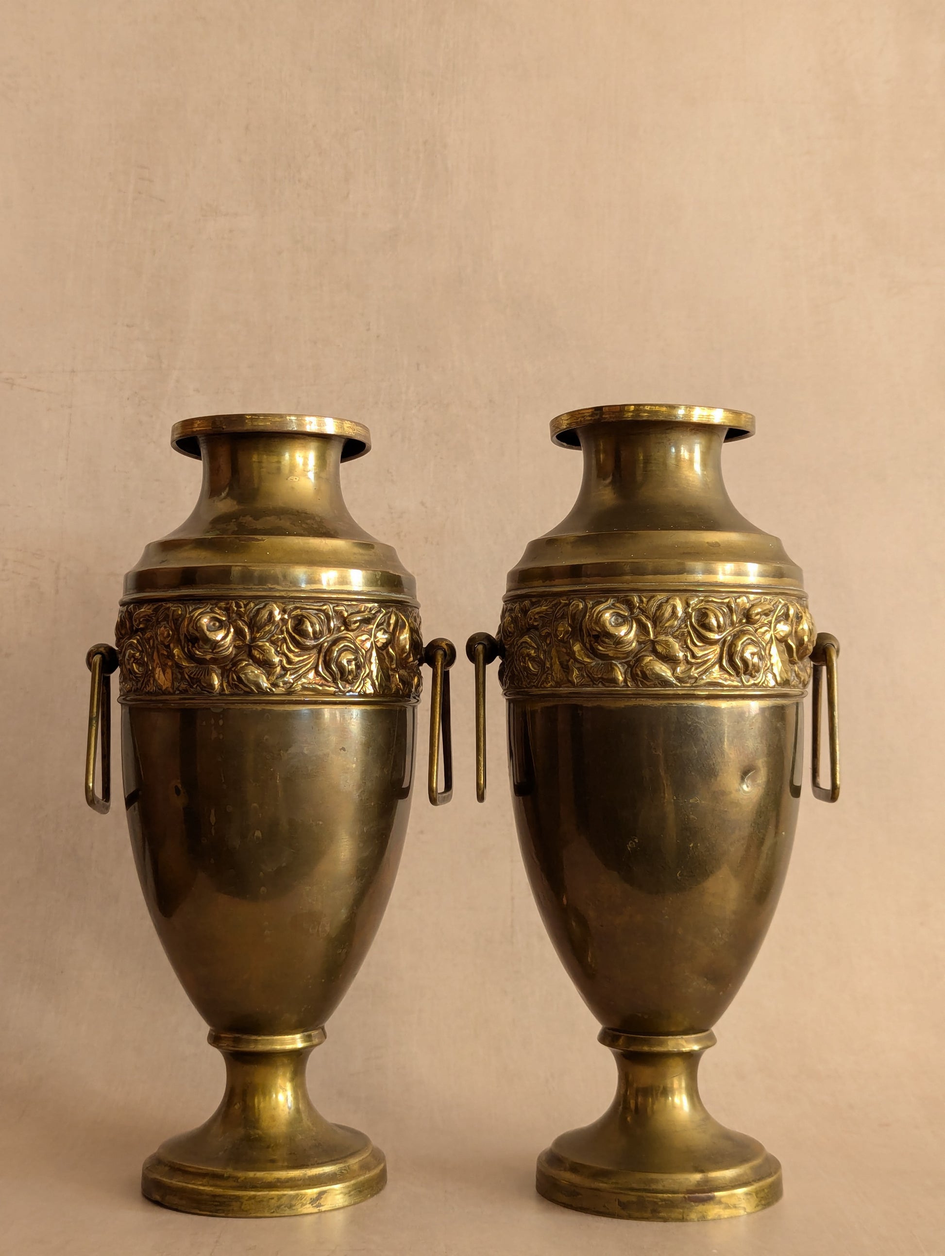 Art Deco Solid Brass Floral Urn Vases - Set of Two