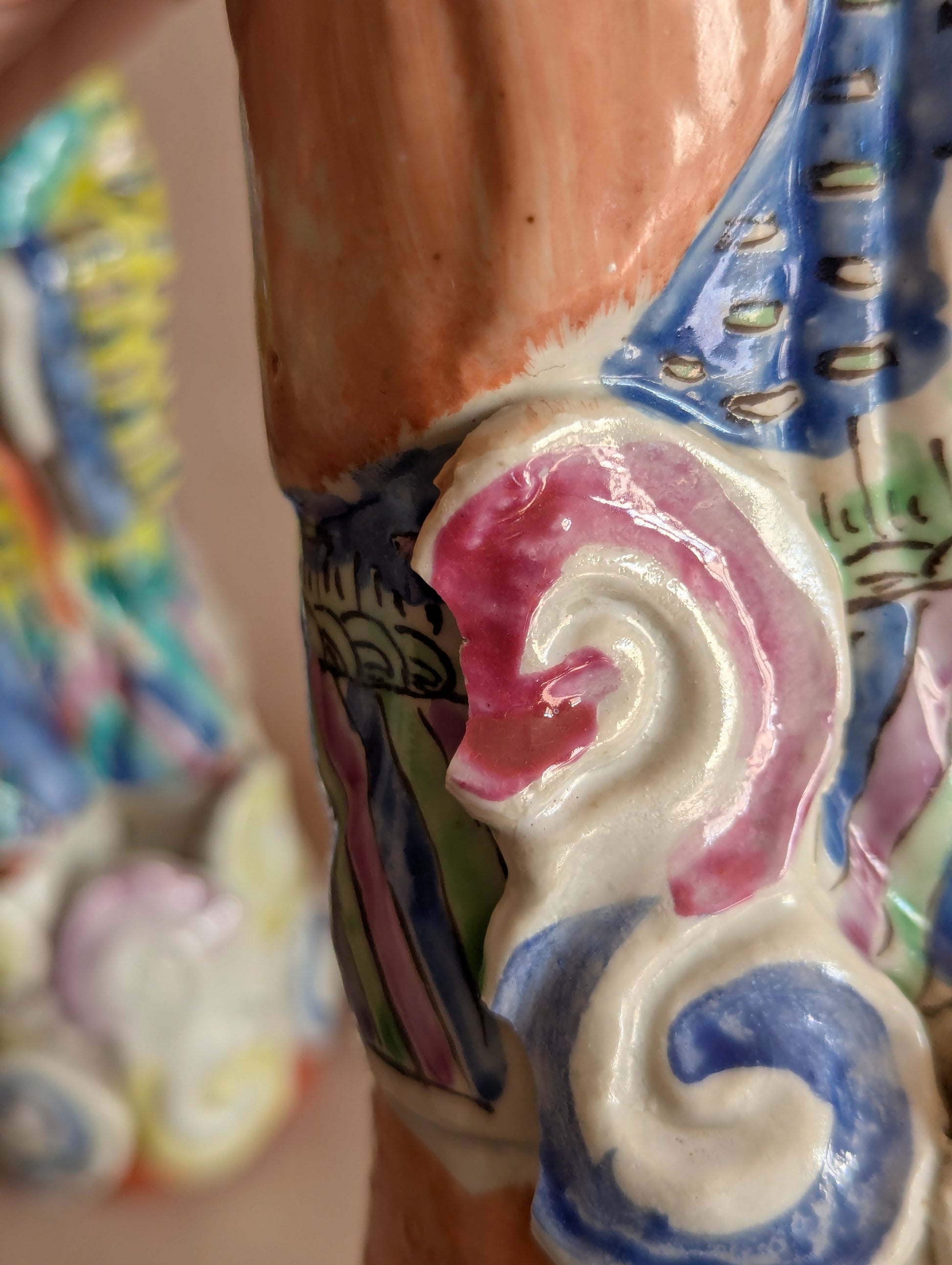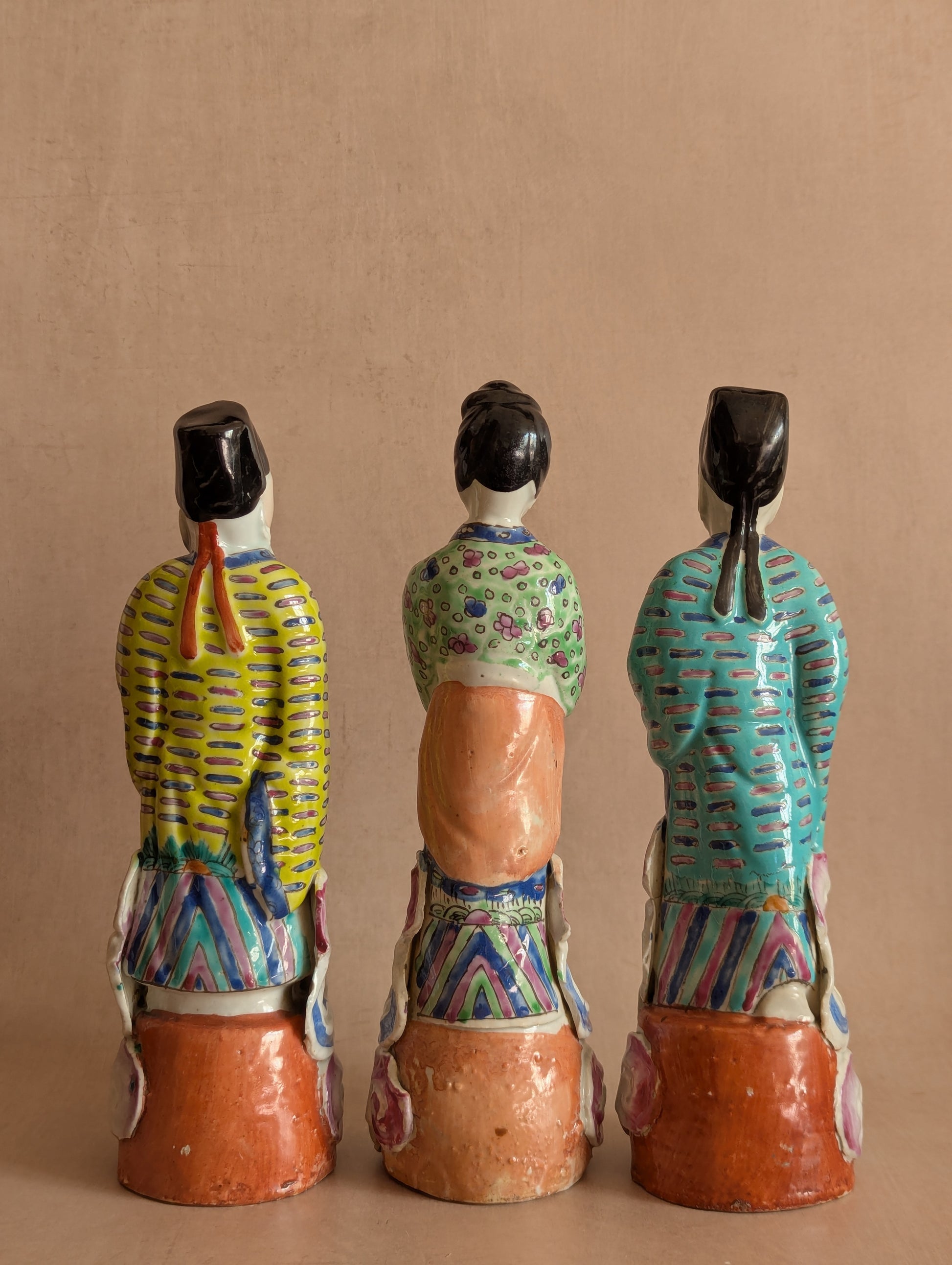 A beautiful triplet set of Chinese porcelain figurines. These are revival pieces of the traditional Famille Rose style, likely sold as souvenirs in the early to mid 1900s. There are a few chips along the edges of the delicate clouds or waves. Otherwise, these are in lovely condition annd the colours are fabulous in person.