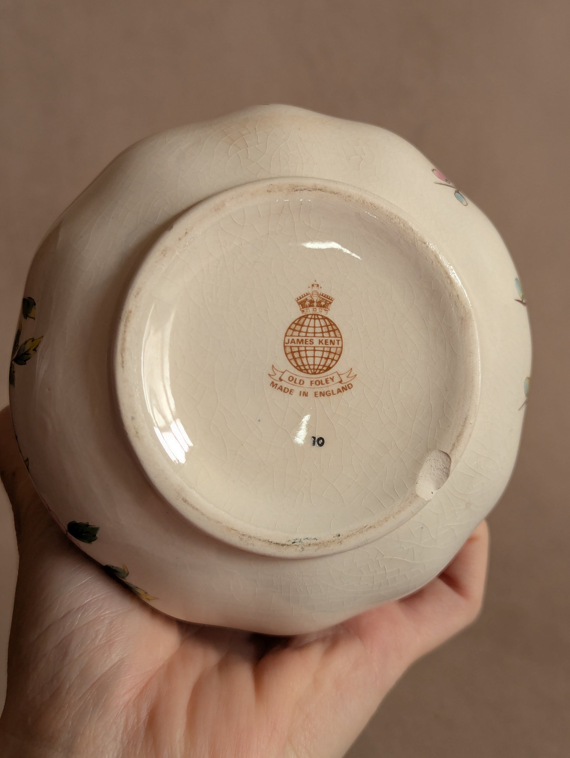 A colorful and cheerful little jug or pitcher featuring a Chinese rose motif with blue and yellow birds. Would make a beautiful vase. Marked "James Kent, Old Foley." Made in England. Vintage c. 1950s.