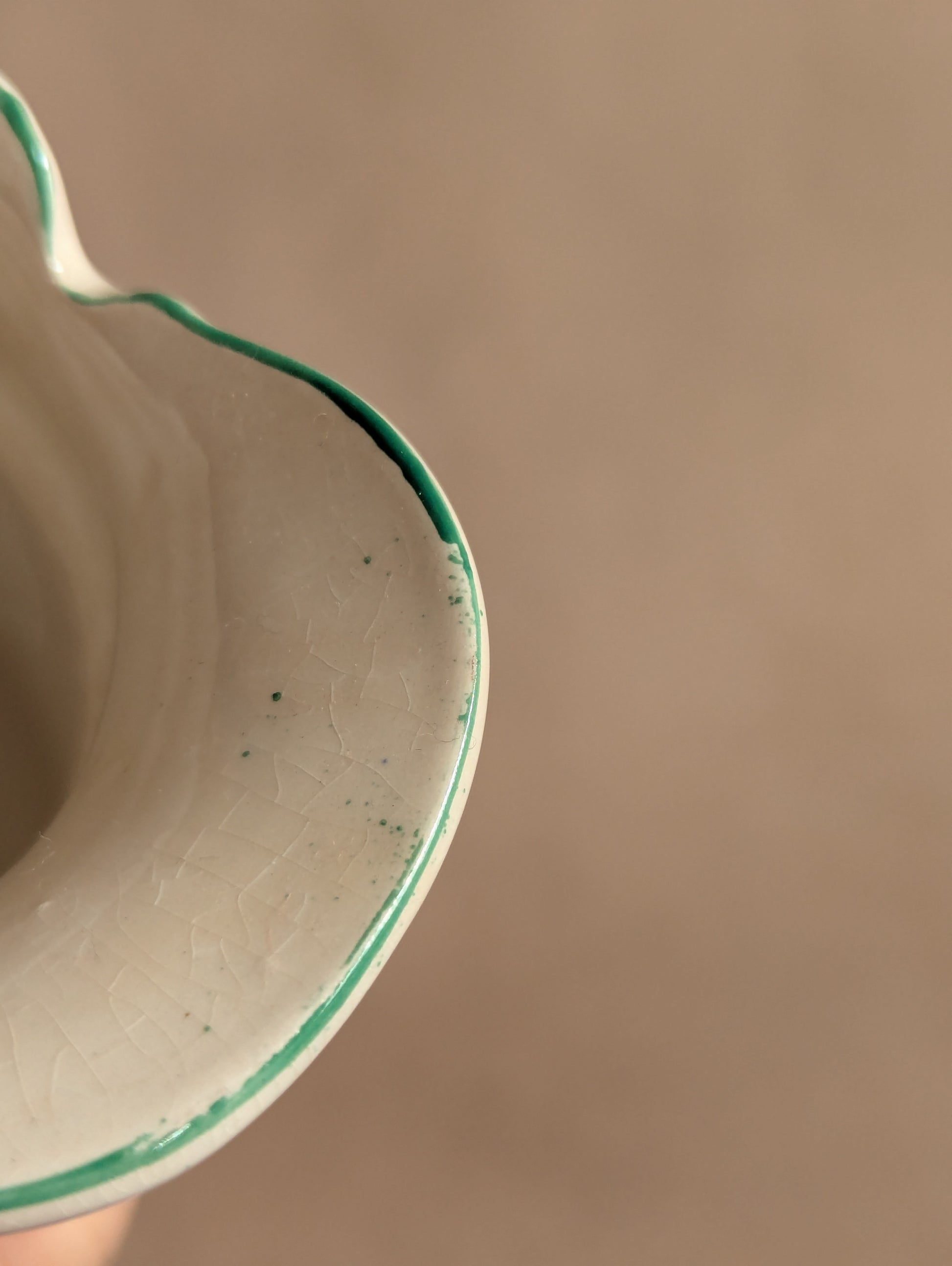 Signs of life include some darkened areas here and there. Small chip on the bottom rim, but otherwise no damage.