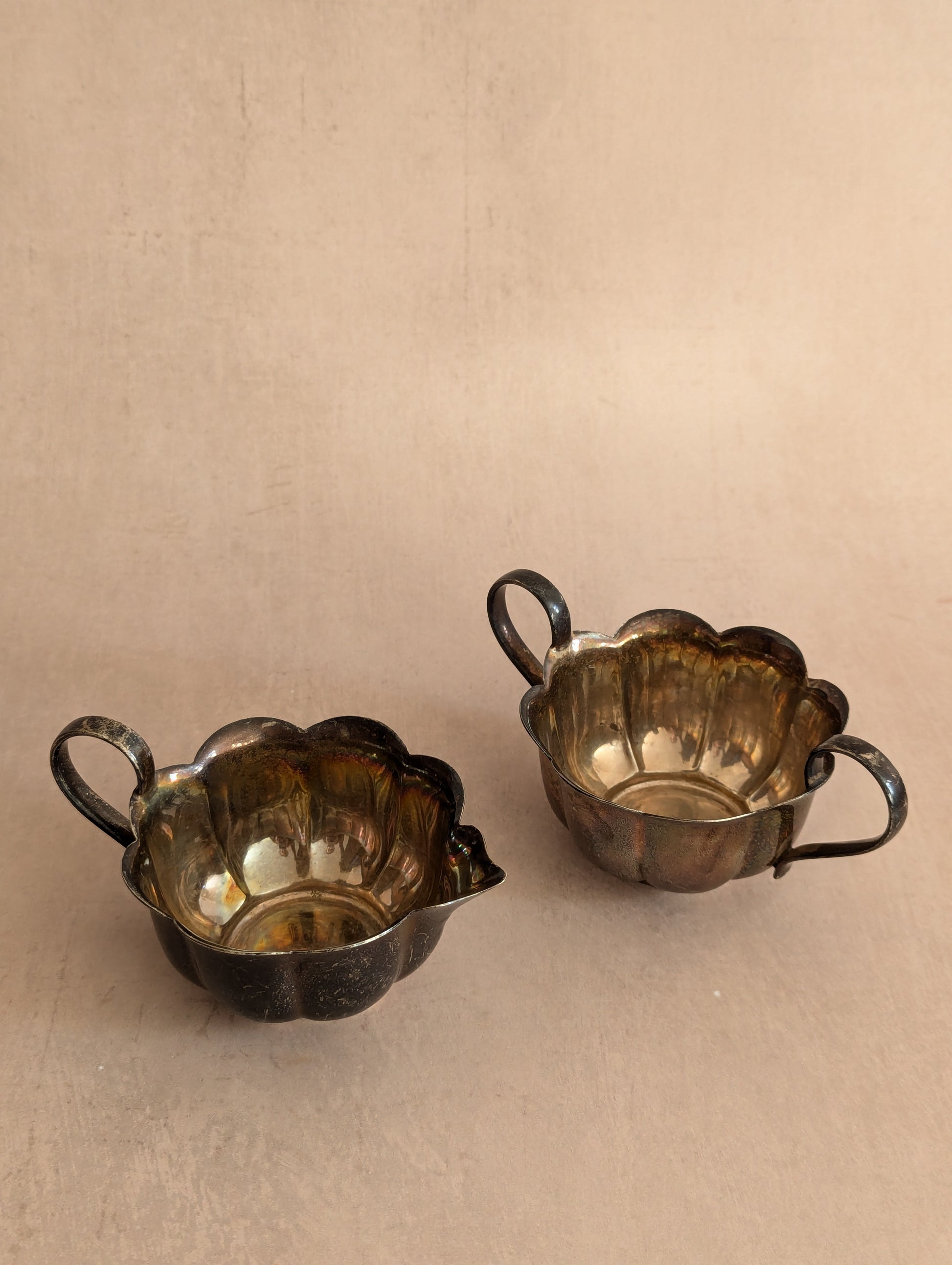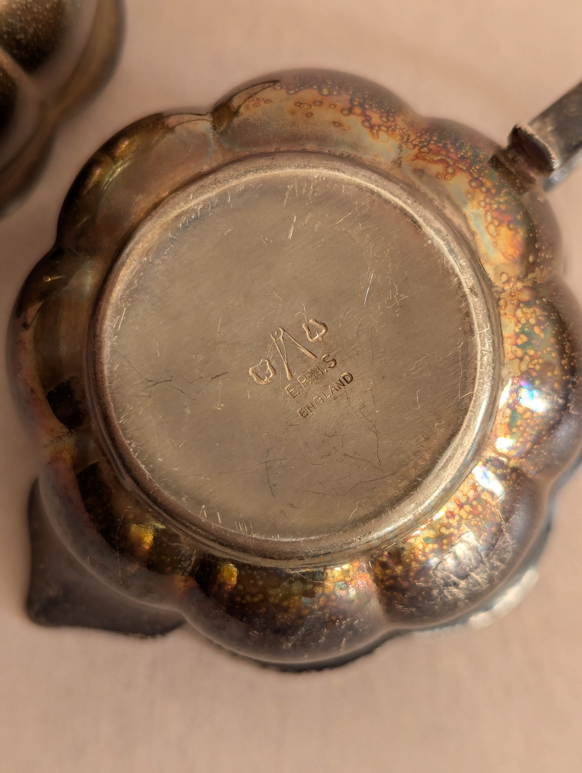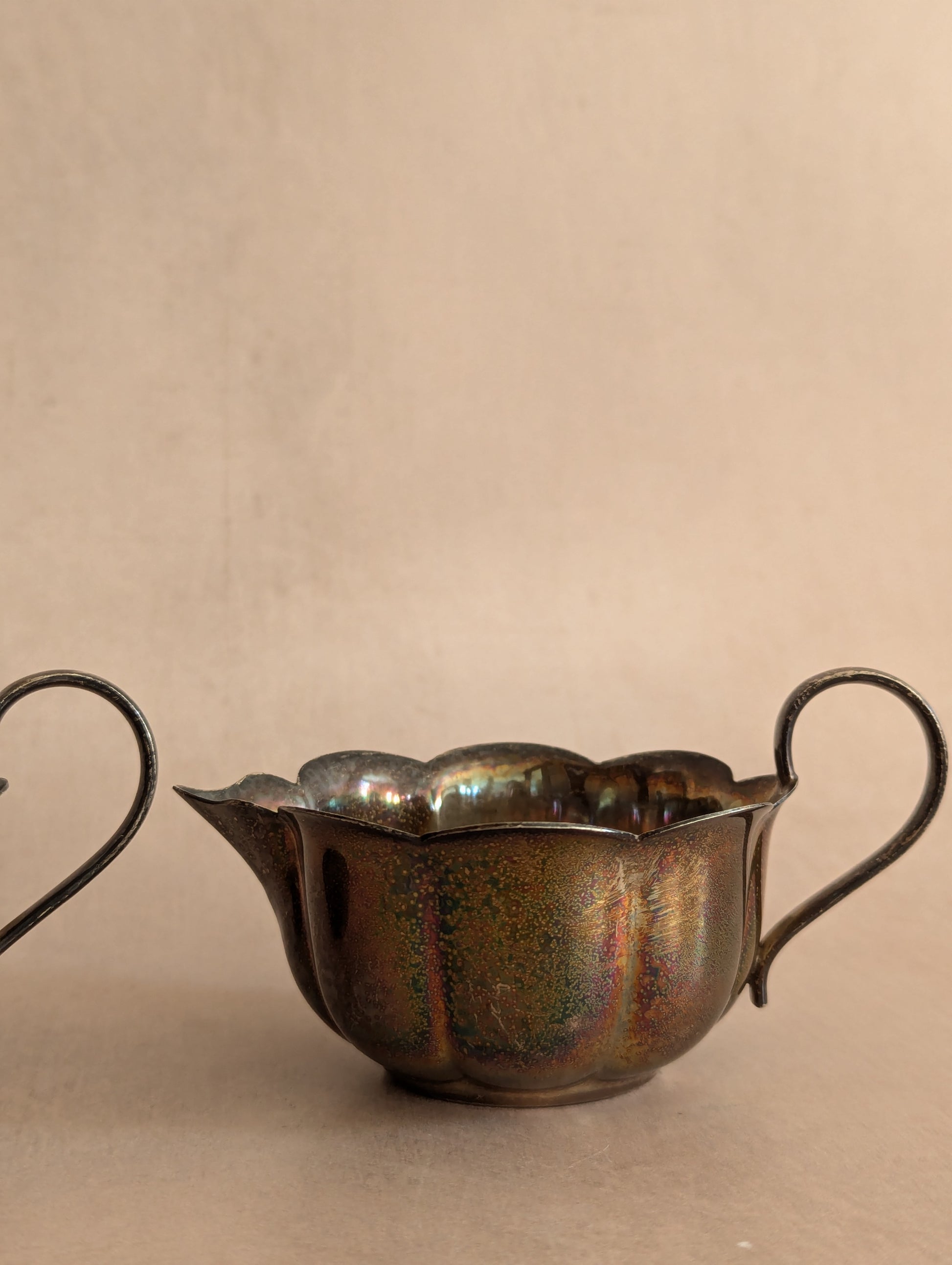 For all the lovers are dark and moody tarnish, a perfectly adorable set of scalloped sugar bowl and creamer cup. Whimsical handles and a deep, dark, rainbow tarnish throughout. Use as intended, turn into storage, or plant some herbs in them. Marked "W.A. EPNS England" on the bottoms. Made in England, vintage c. mid-century.