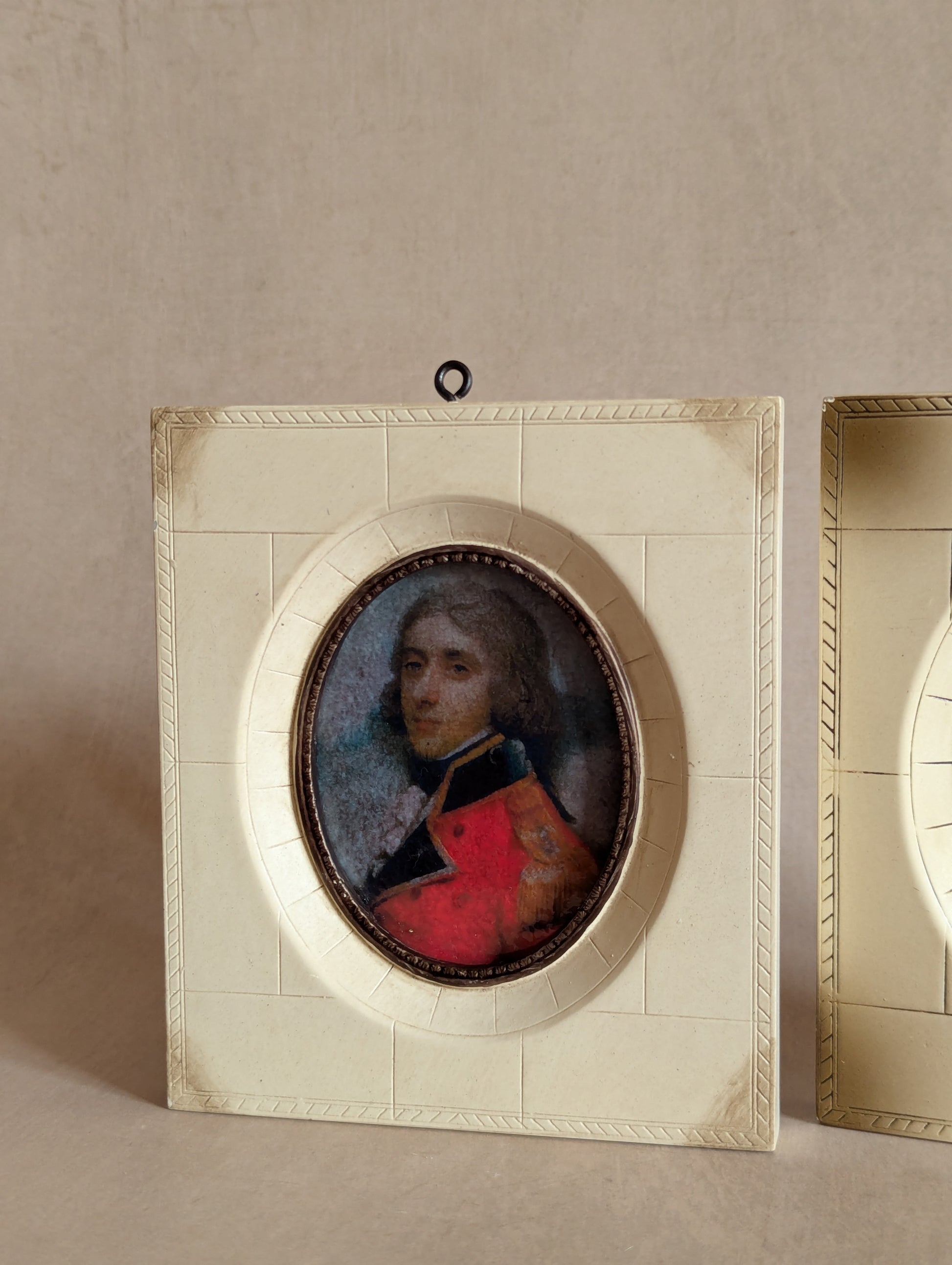 A lovely pair of revival-style frames with small portraits of gentlemen in the oval windows. This style is modeled after the bone frames from the 18th/19th centuries. Likely souvenirs c. late 20th century. Sturdy hooks at the top are ready for a ribbon of your choice before hanging on the wall. They both have a nice weight to them.