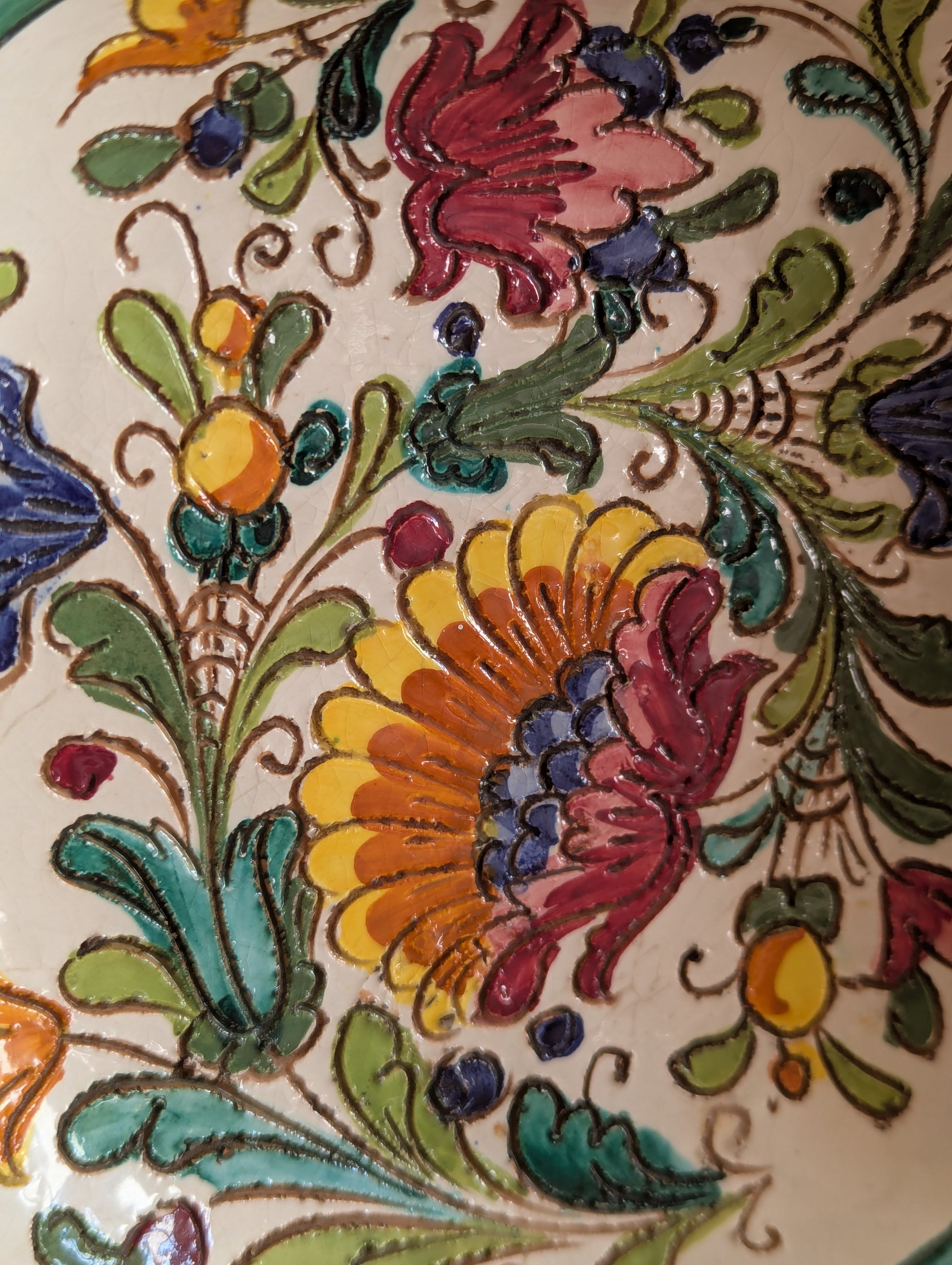 A wonderful Fratelli Fanciullacci piece that is very playful and perfect for brightening up a blank space. Features handpainted florals, engraved textures, and a sturdy loop on the back for easy hanging. Marked Italy on the back. Vintage c. mid-century.