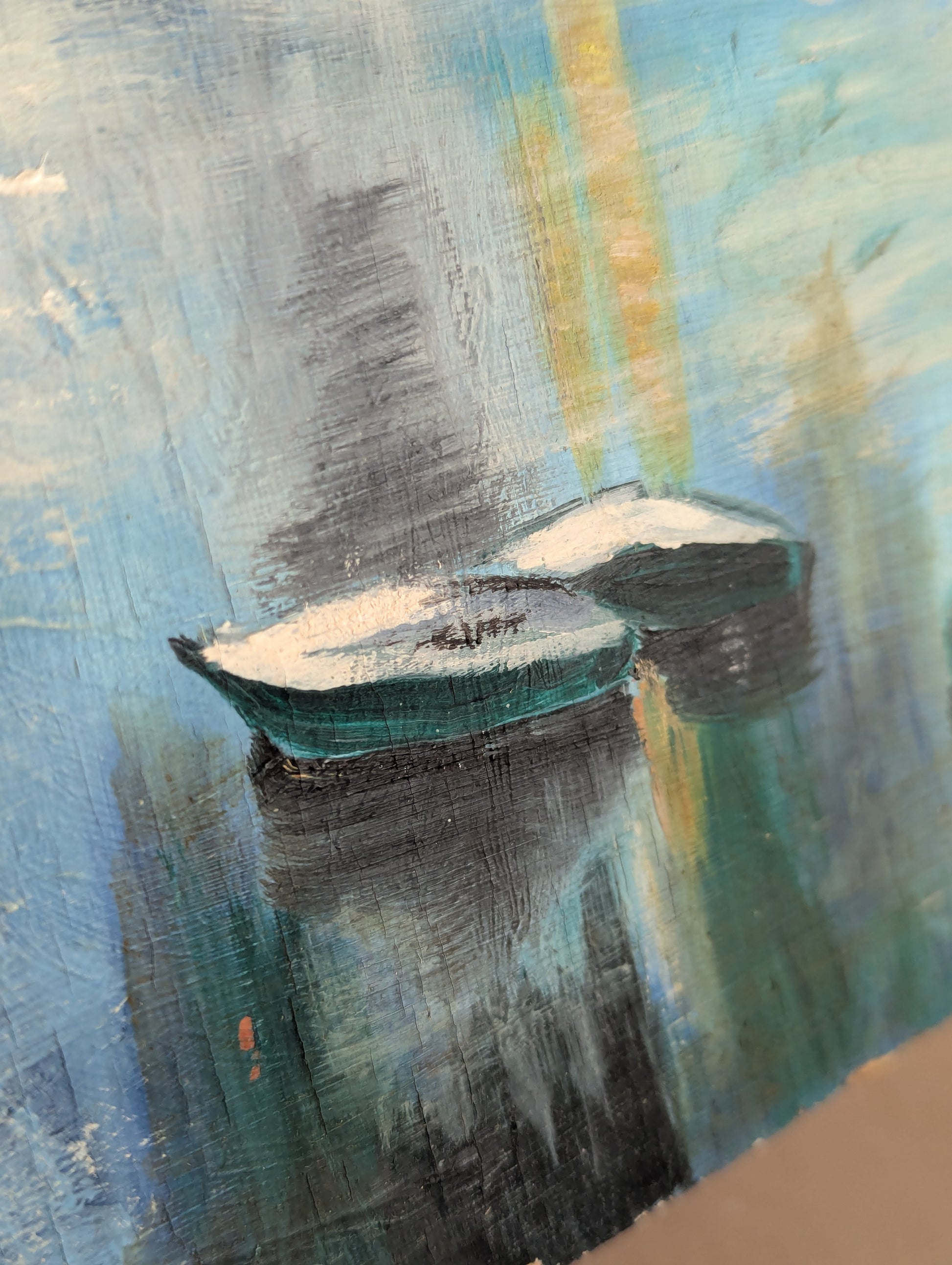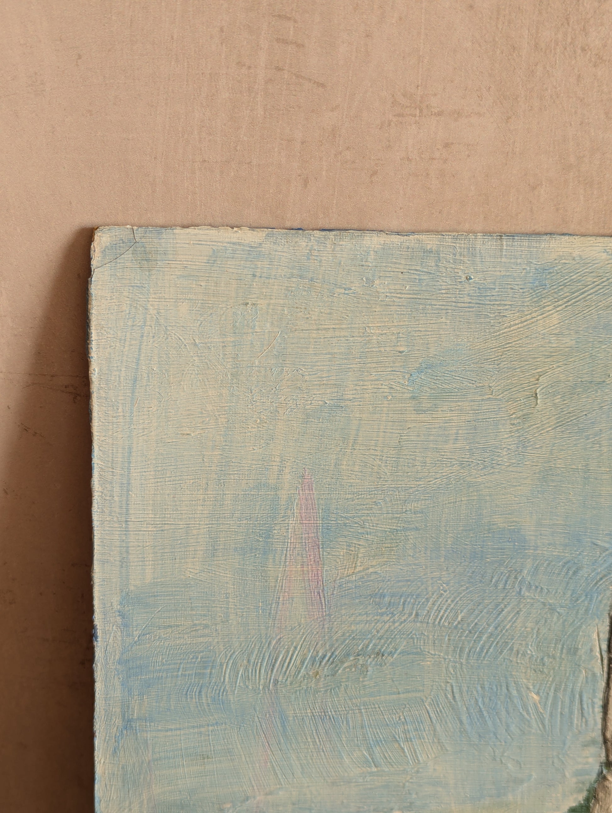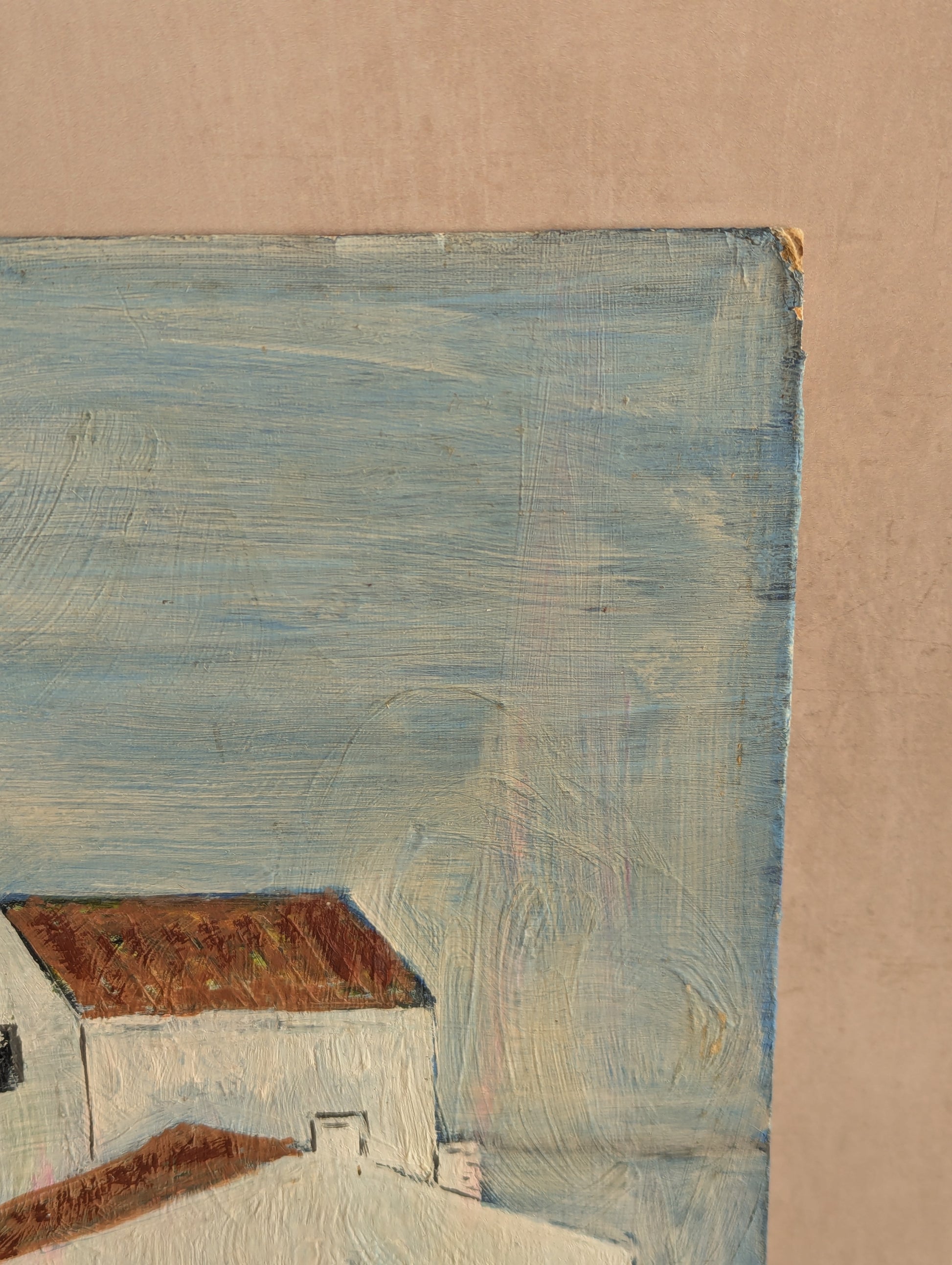 Blues, boats, and white-washed walls make up this lovely landscape of what appears to be a church or possibly a more industrial collection of buildings alongside a gentle waterway. Notice the boats and the reflections on the water - quite peaceful. A bit of a naive folk style leaning towards impressionism. It captures the essence of a slow Sunday quite nicely.