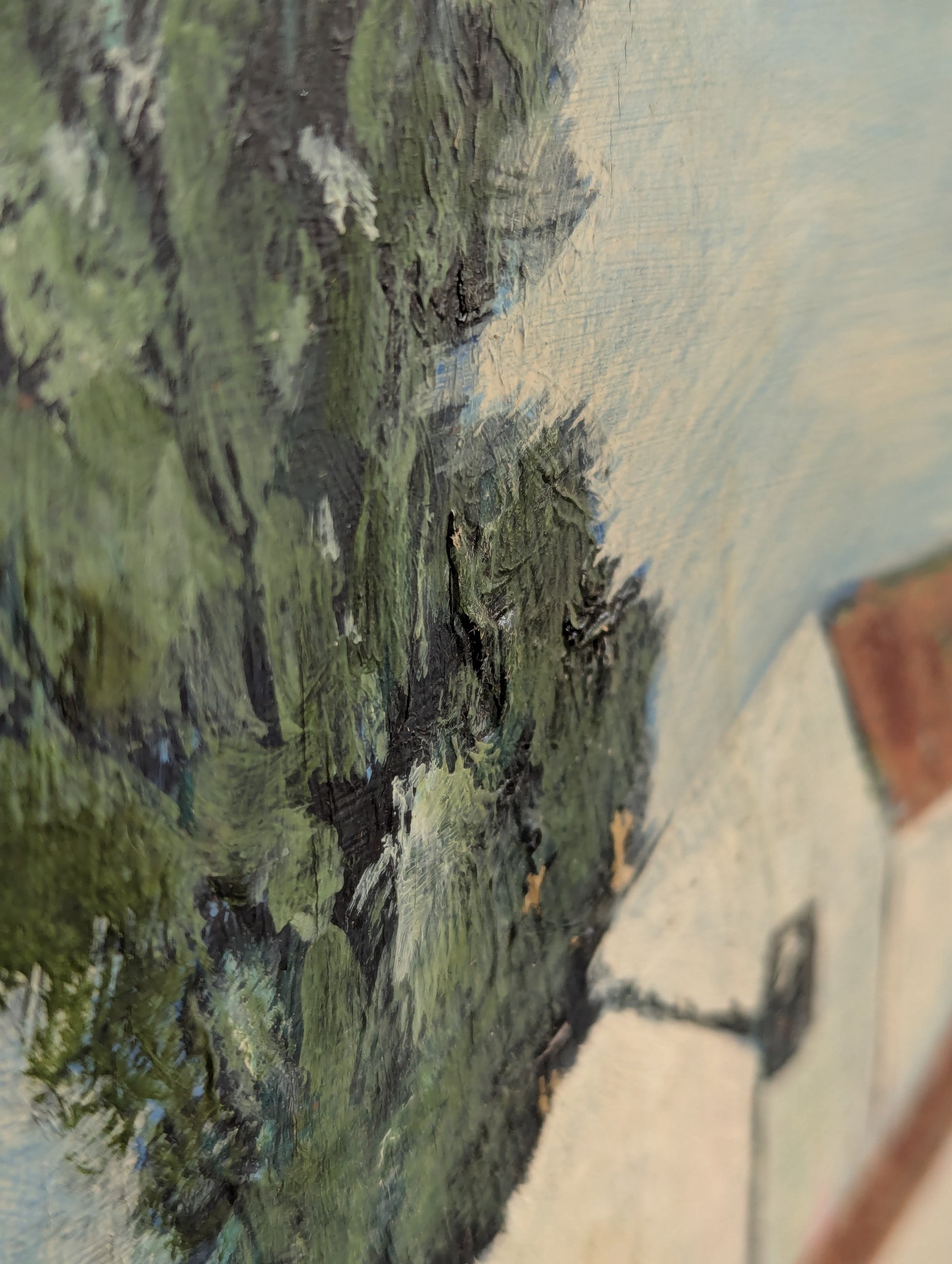 Signs of a life lived include rough edges and small surface imperfections. The bottom left corner shows a small spot where it looks like tape has lifted some of the original surface. Some craquelure beginning to form along the corners as well. Study photos carefully.
