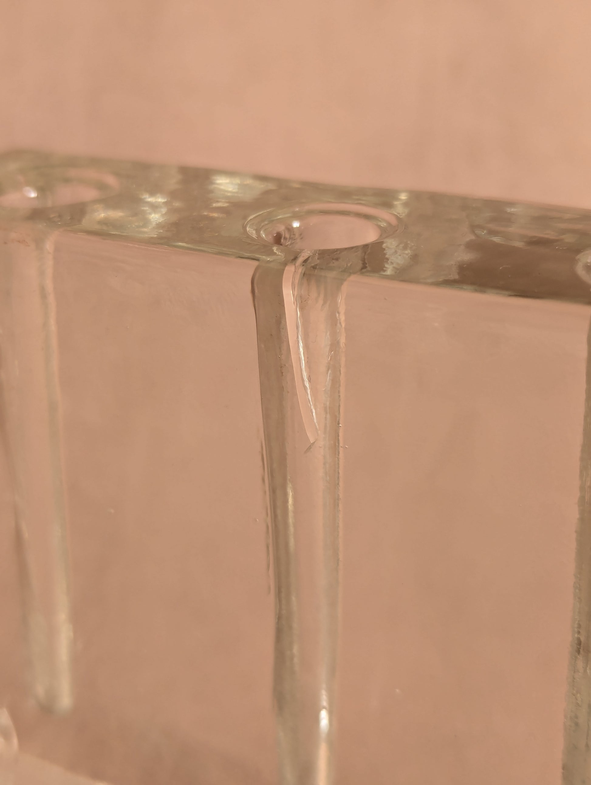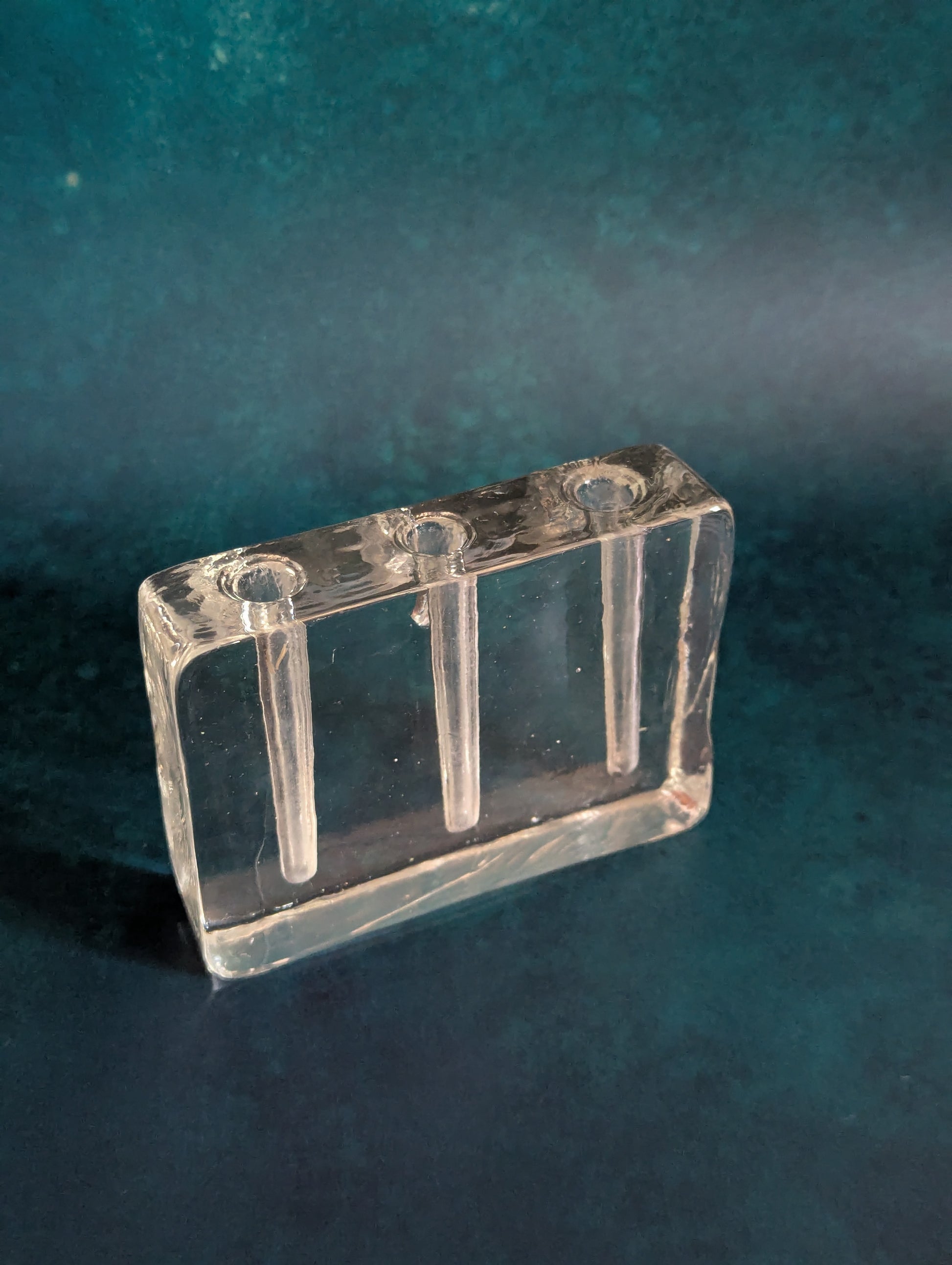 Quite a powerful little piece - solid glass with room to display three individual stems. Very heavy. Gives off a wonderful brutalist "ice block" look. Vintage c. mid-century.