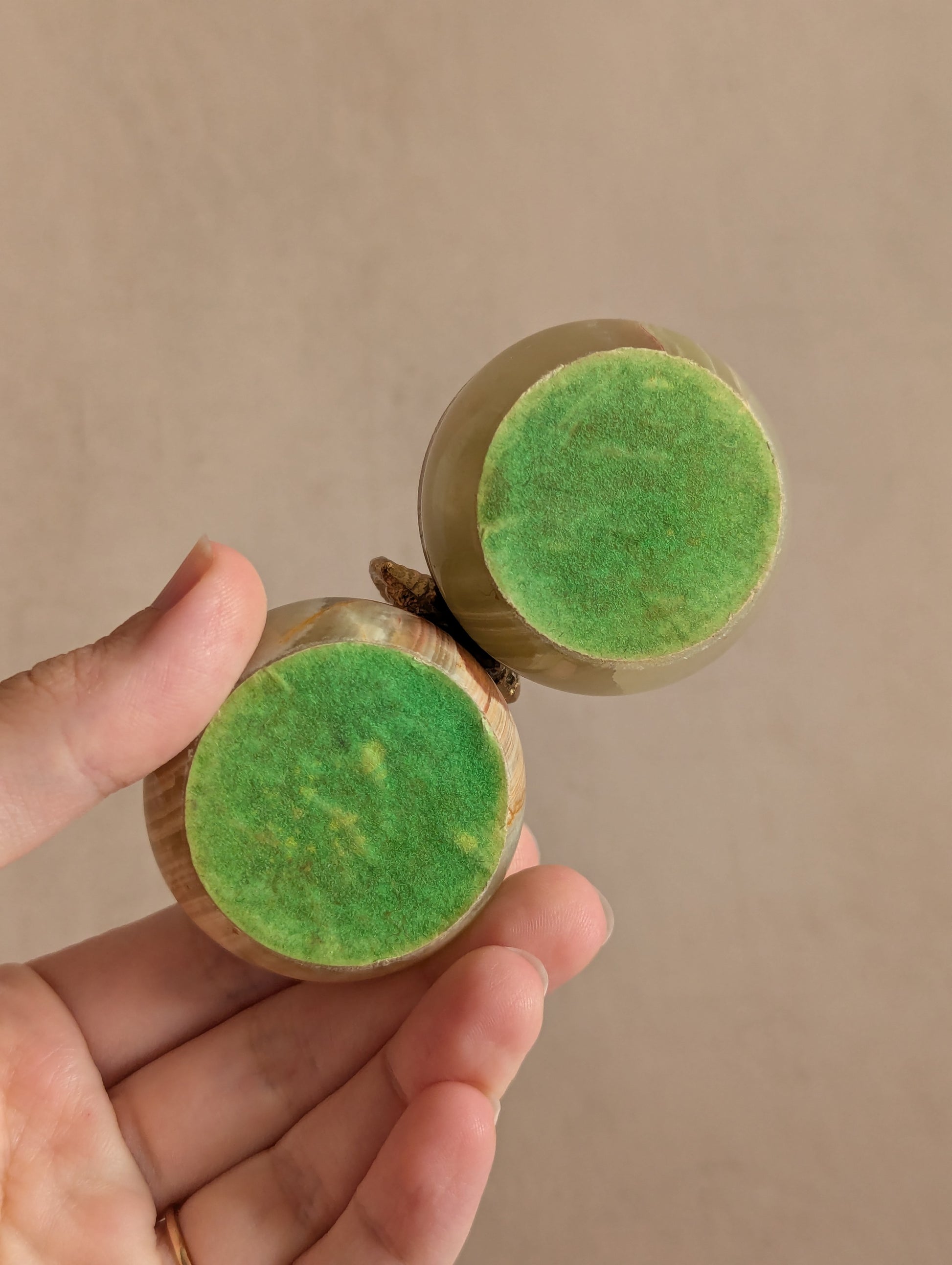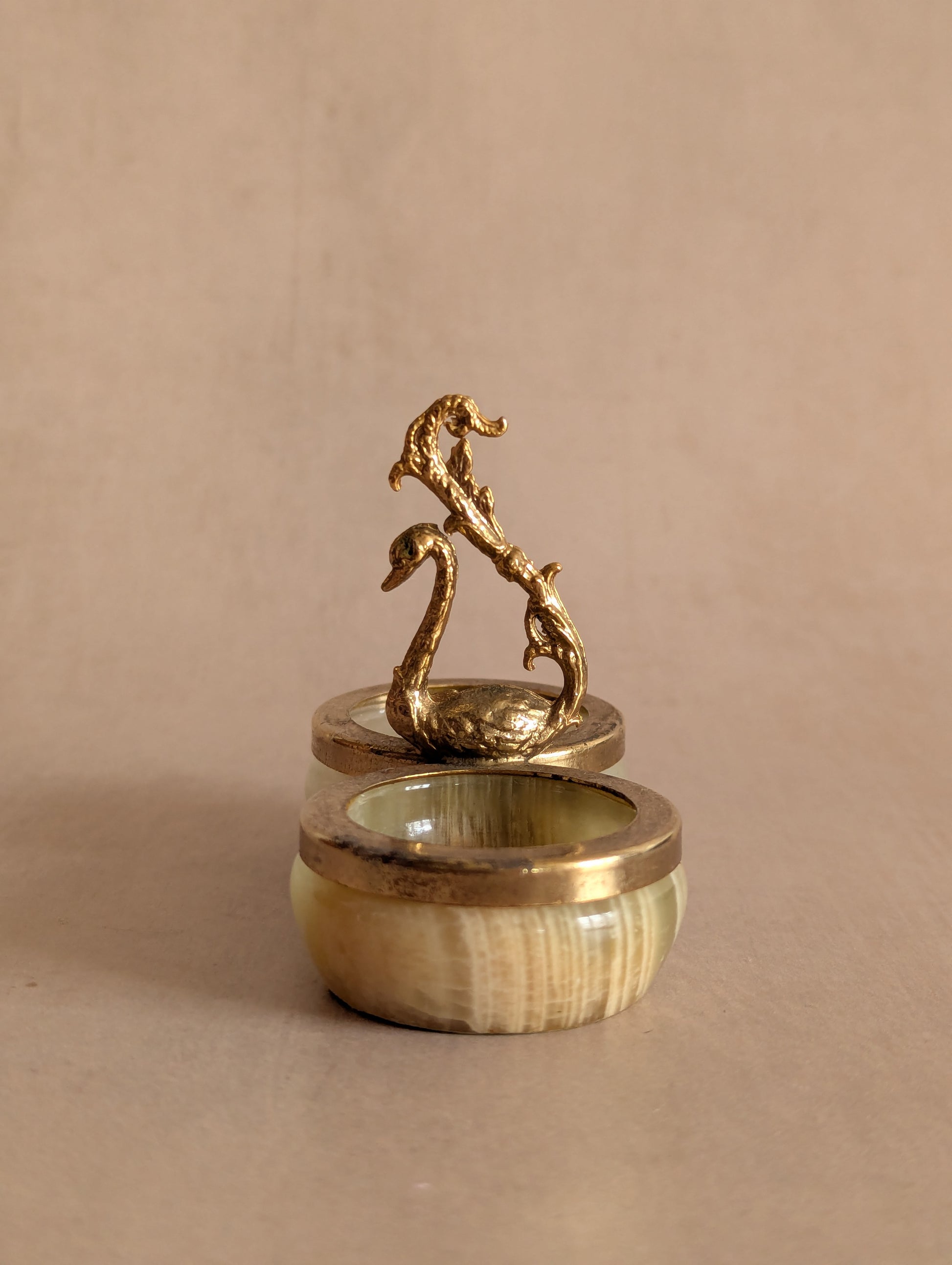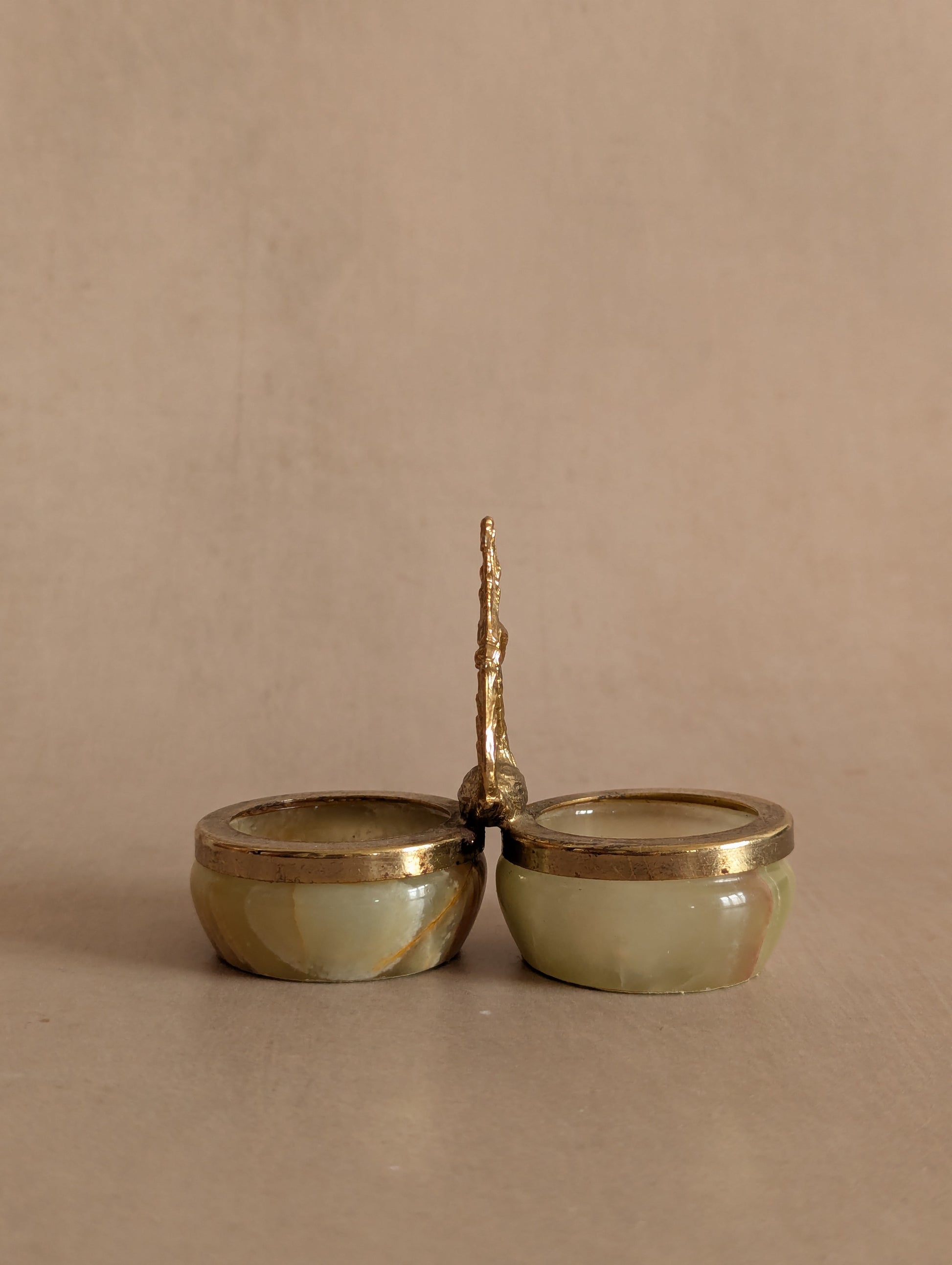 So dainty and beautiful! A small condiment dish featuring two green onyx cellars or bowls. Use it at dinner for salt & pepper or double it up with sugar for everyone's tea or coffee. Gold-tone metal rims and swan handle that are quite sturdy, as well as a soft paper under the bases to prevent scratches. Vintage c. 1960s.