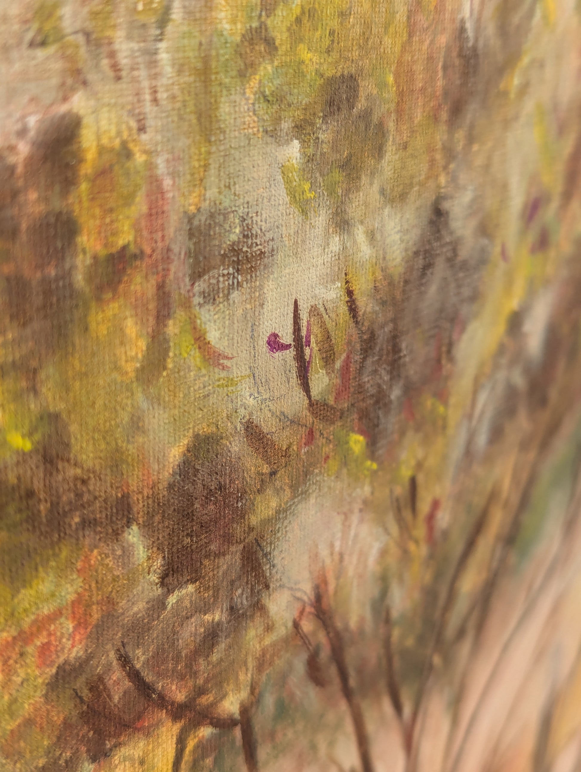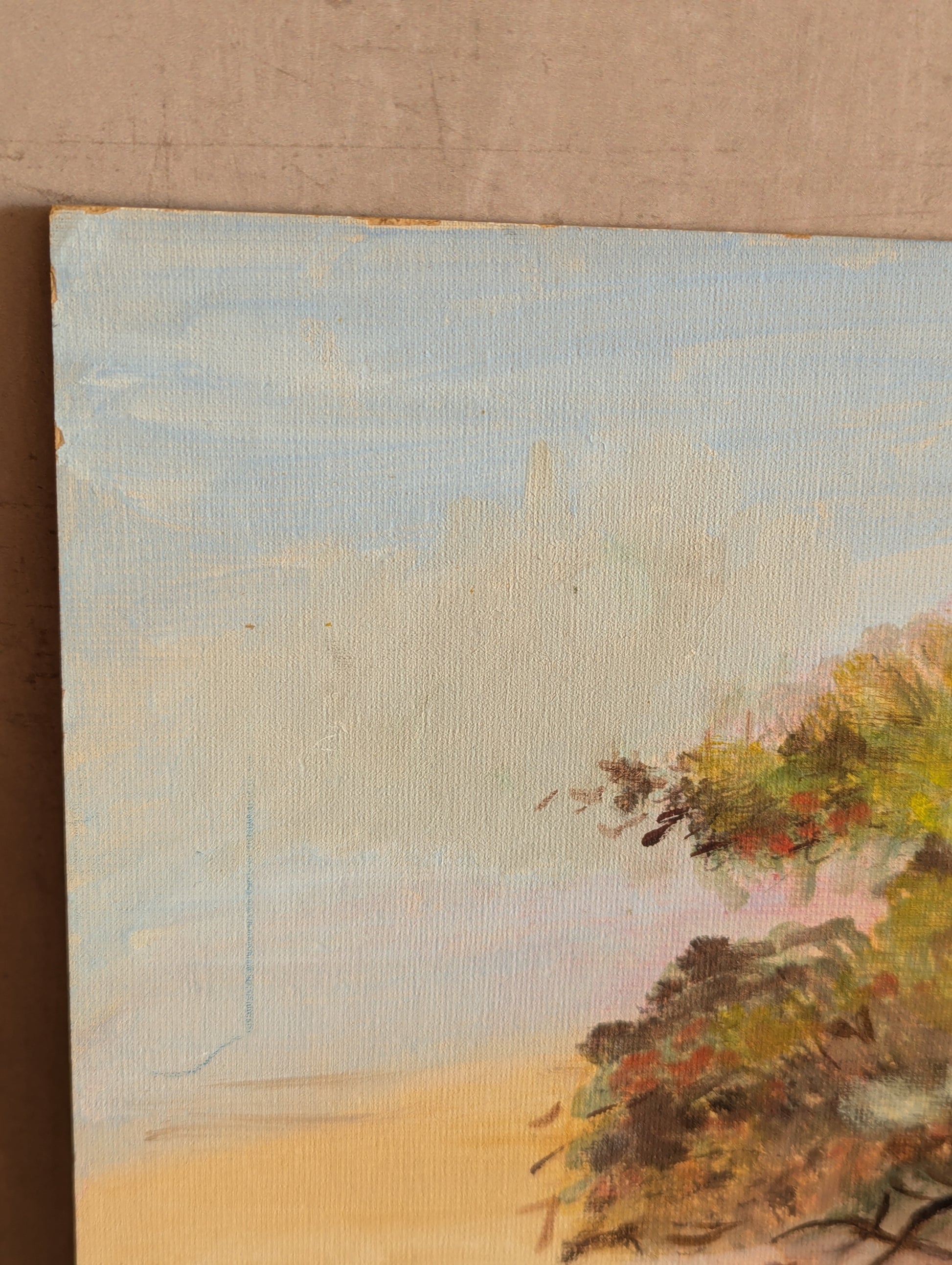 A lovely solitary tree against the backdrop of a pastel sunrise. Would look terrific leaned up atop a wall unit or bookcase. Would also benefit from a lovely frame. Oil painting on board, unsigned, undated. Vintage c. 1970.