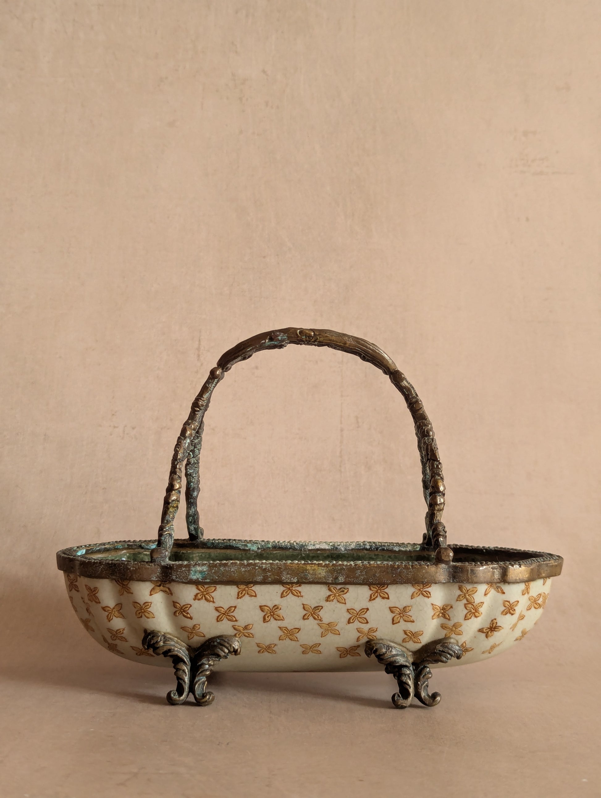 A gorgeous revival piece mirroring 18th-19th century decorative styles. The bowl features lovely scrollwork alongside a delicate floral motif, and the rim, handles, and feet are made of an intricate cast metal that has a nice weight to it. Likely vintage c. late 20th century.