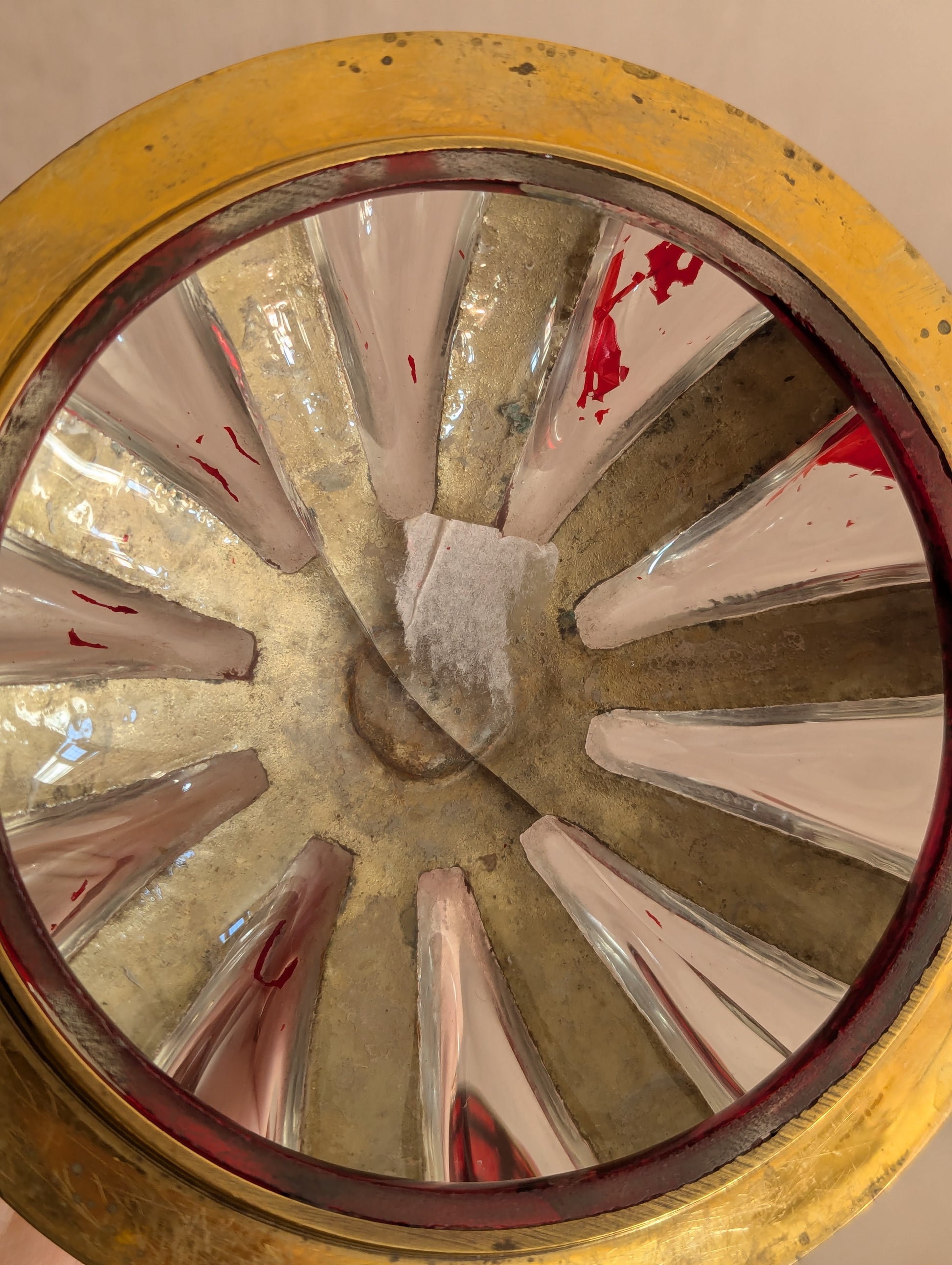 A single crack across the length of the glass in the lid, but no pieces are loose. The red finish has also worn away inside the lid. Everything else is very sturdy, no other damage. An extremely heavy piece.