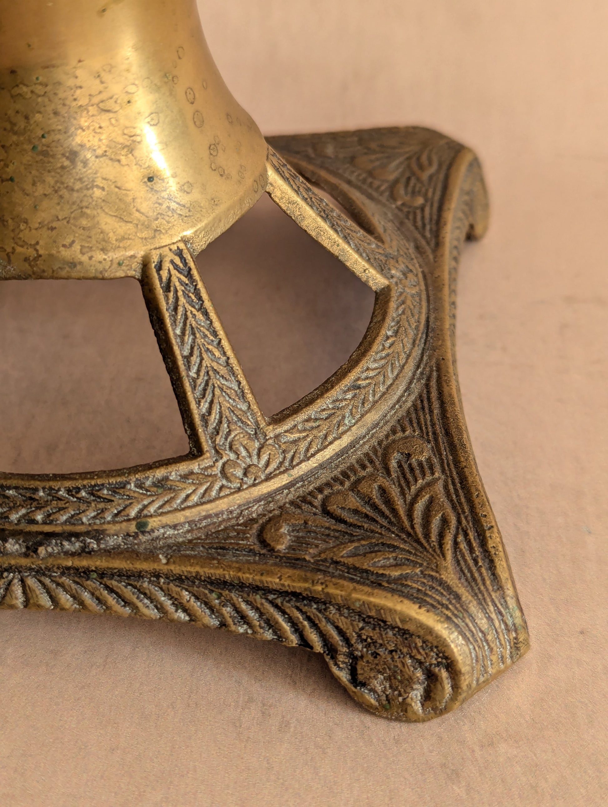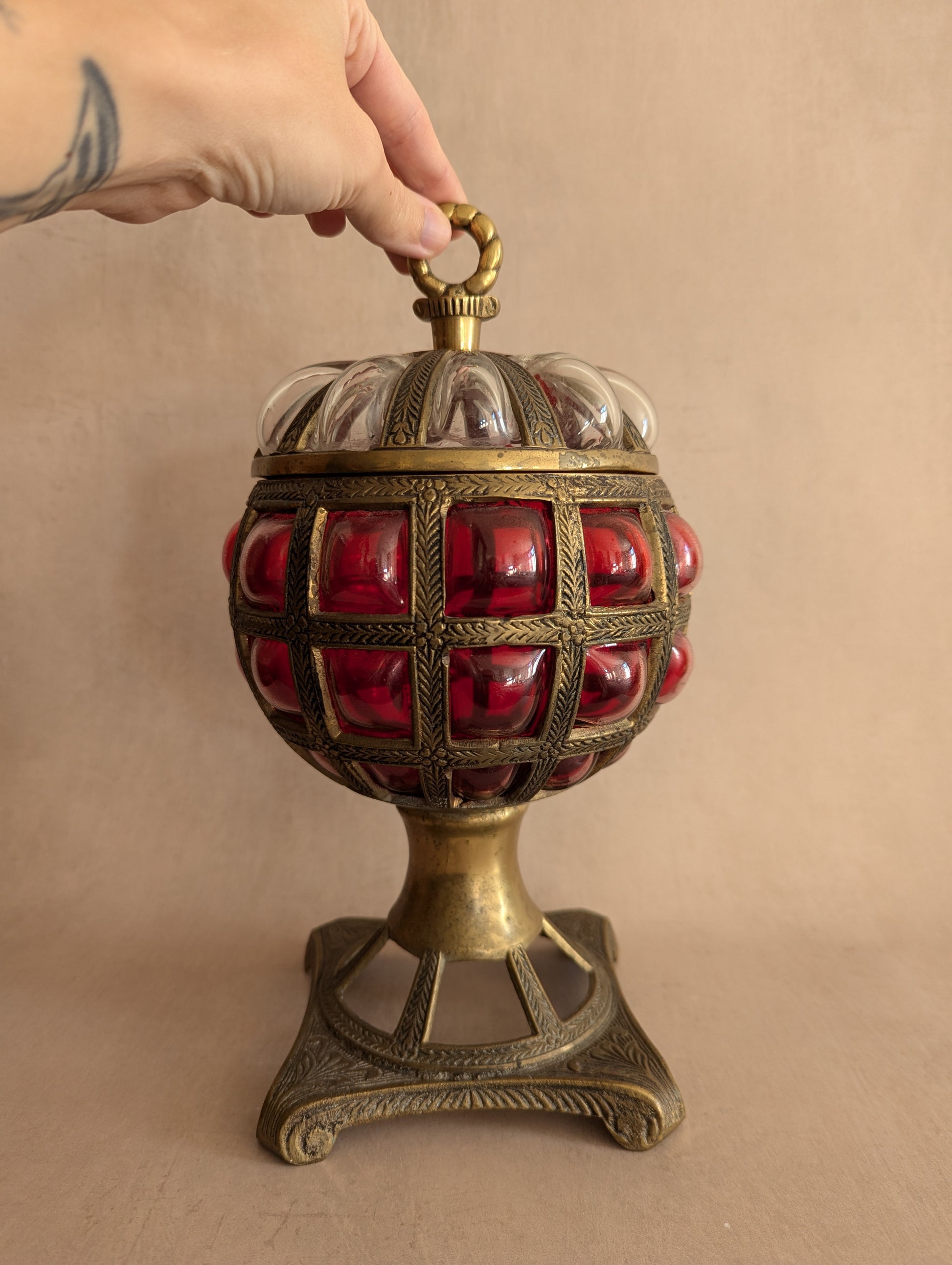 Without a doubt, an incredibly impressive piece. A brass base with intricate detailing that moves upward into a geometrical caged globe with matching lid. Glass was then blown into the interior, causing it to expand through the cage openings, forming an absolutely stunning piece of art. Finished with a ruby red colour. Likely made in India. Vintage c. mid-century.