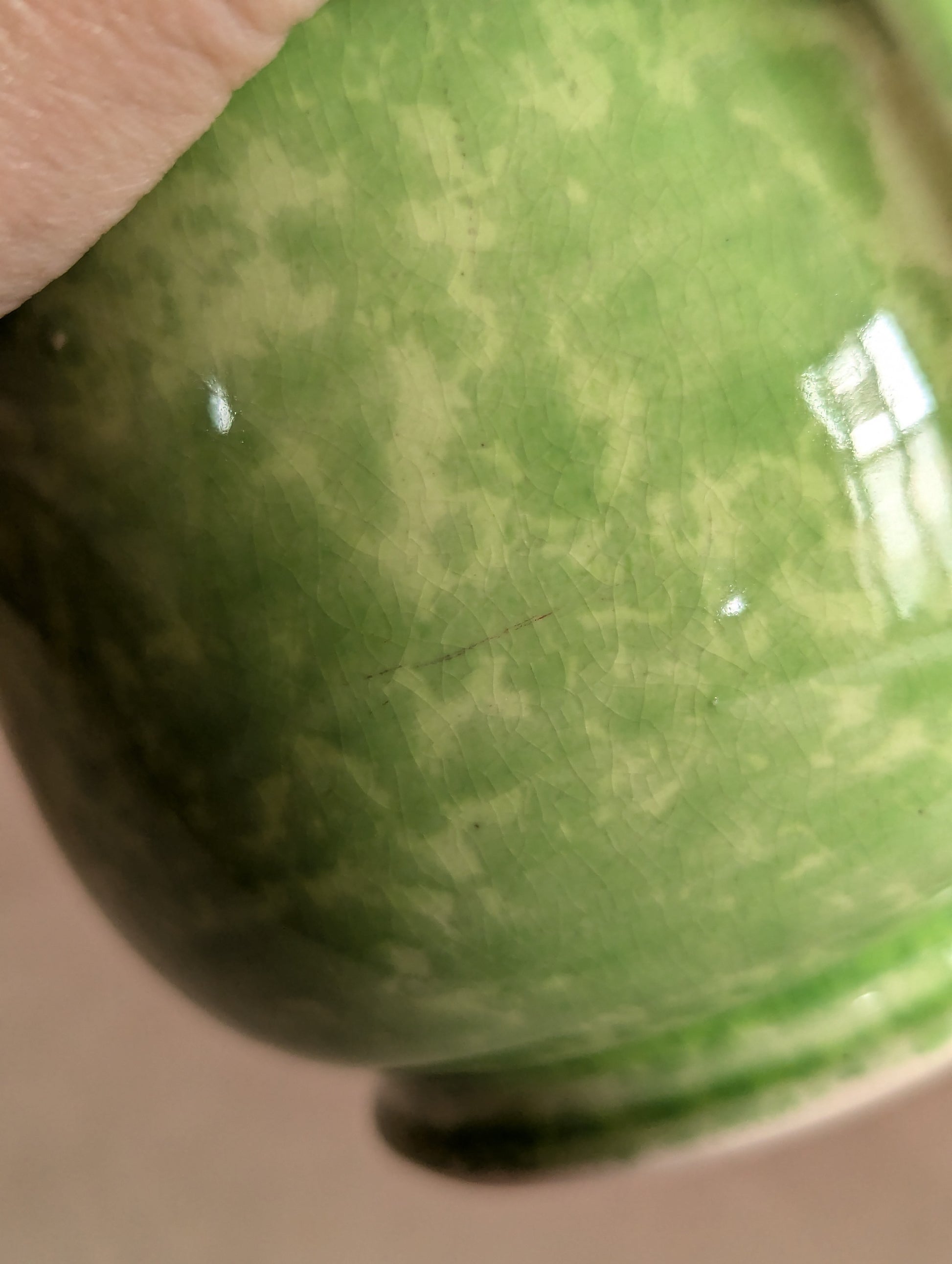 A very fun & bright little thing! Lime green with dappled sponge marks - this little creamer mug is an uplifting addition to your table. Use for hot or cold liquids, organizing utensils, or turn it into a vase. Marked Sadler, made in England. Vintage c. 1940s-50s.