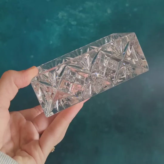 A beautifully cut crystal glass box, perfect for jewellery or other tiny treasures. Features a starburst design across the base. Quite heavy given its size. No chips or cracks, in wonderful condition. Vintage c. early to mid 20th century.