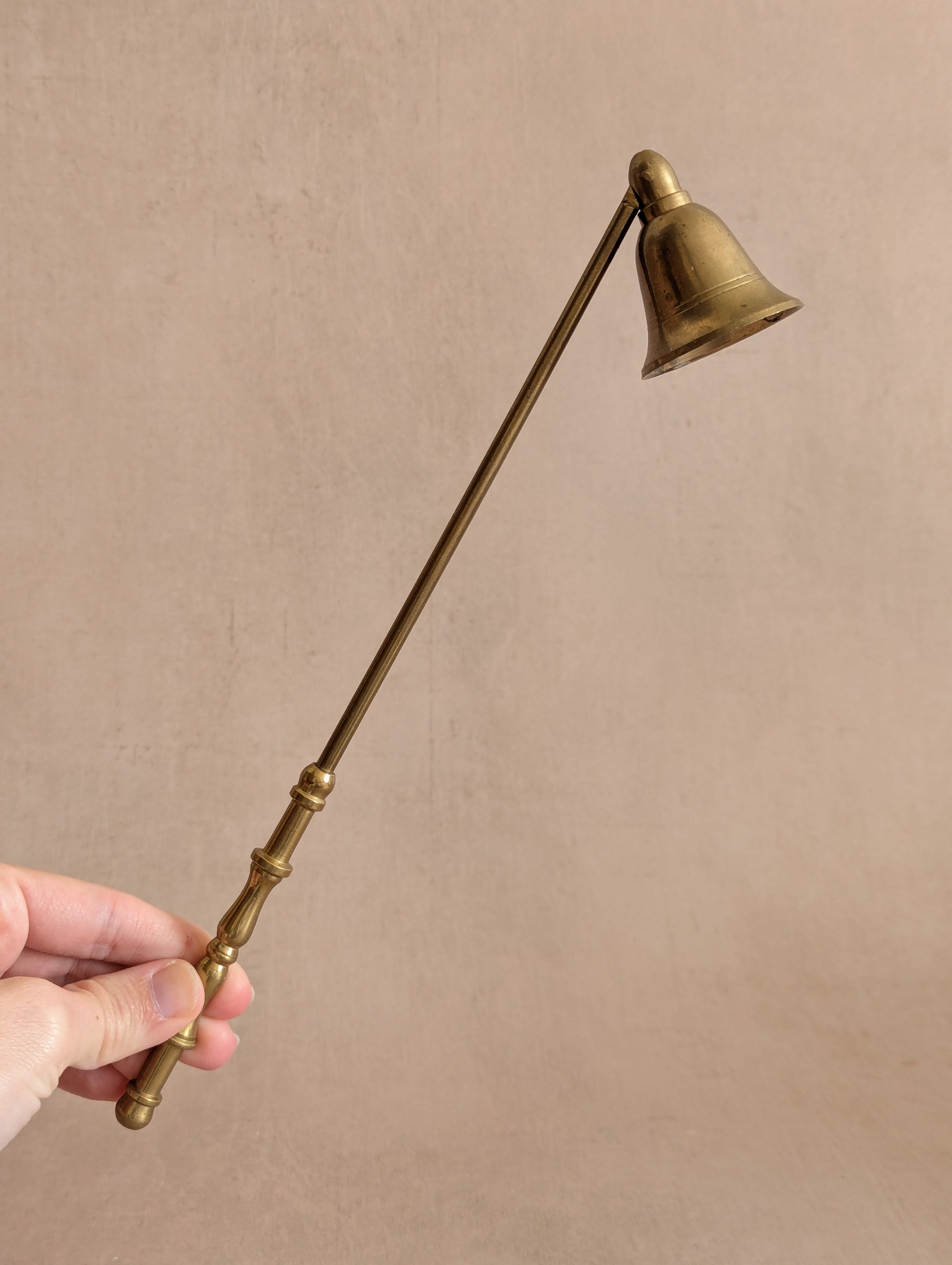 A classic brass snuffer with feminine details including a flared bell and lovely curve-and-ball handle. Vintage c. mid-late 20th century. Soft patina with minimal wax remnants. When resting, it measures 27.5cm long.