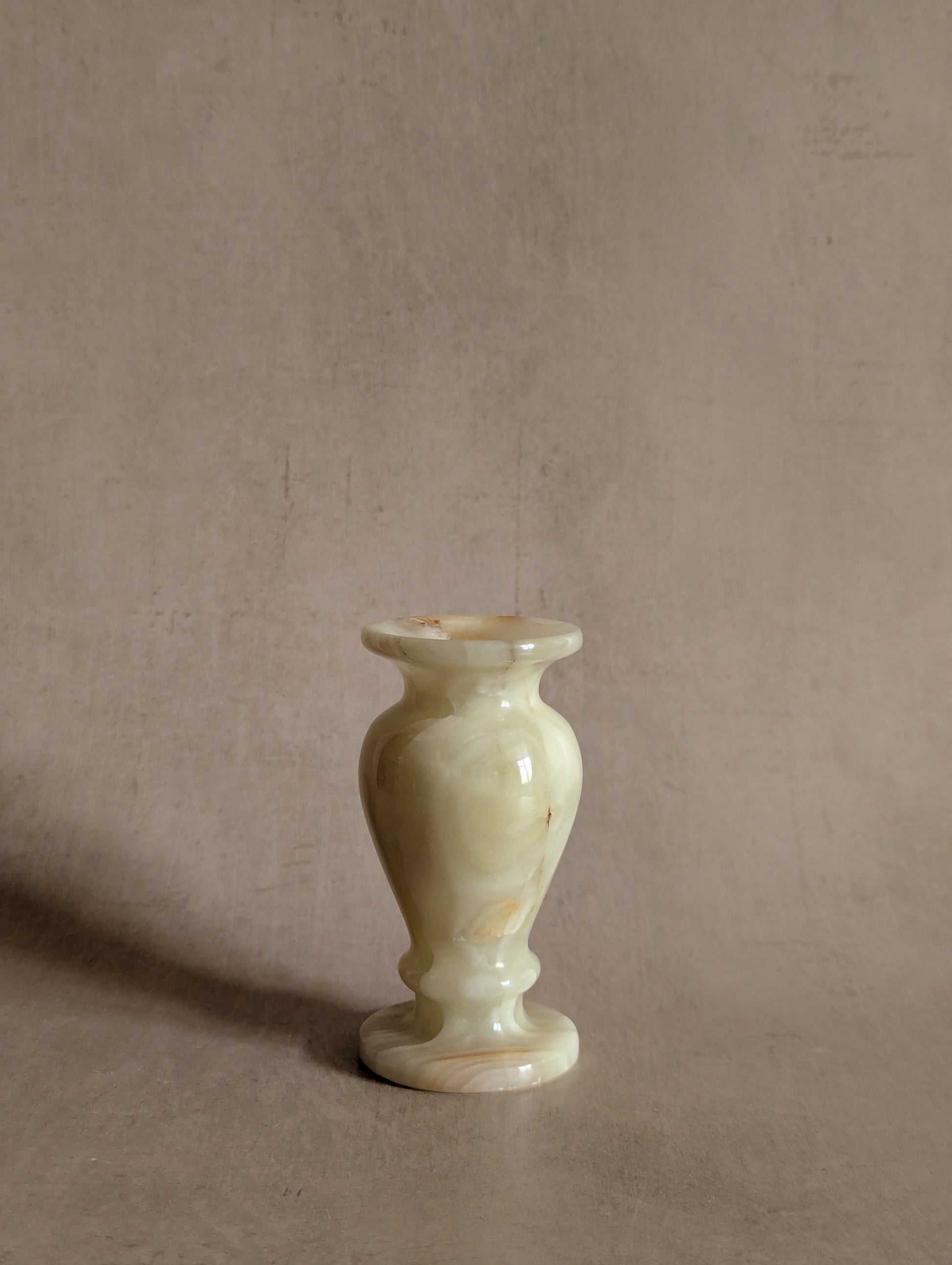 An incredibly sweet snow white onyx bud vase with minimal brown accents. Features a classic flare at both the opening and the base with one small rib around the stem. Opening is very slim - perfect for a single stem. Likely vintage c. late 20th century.