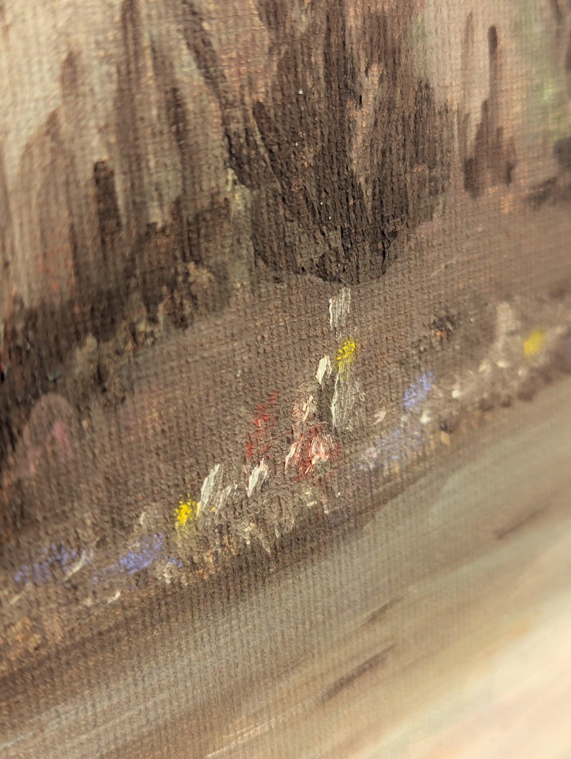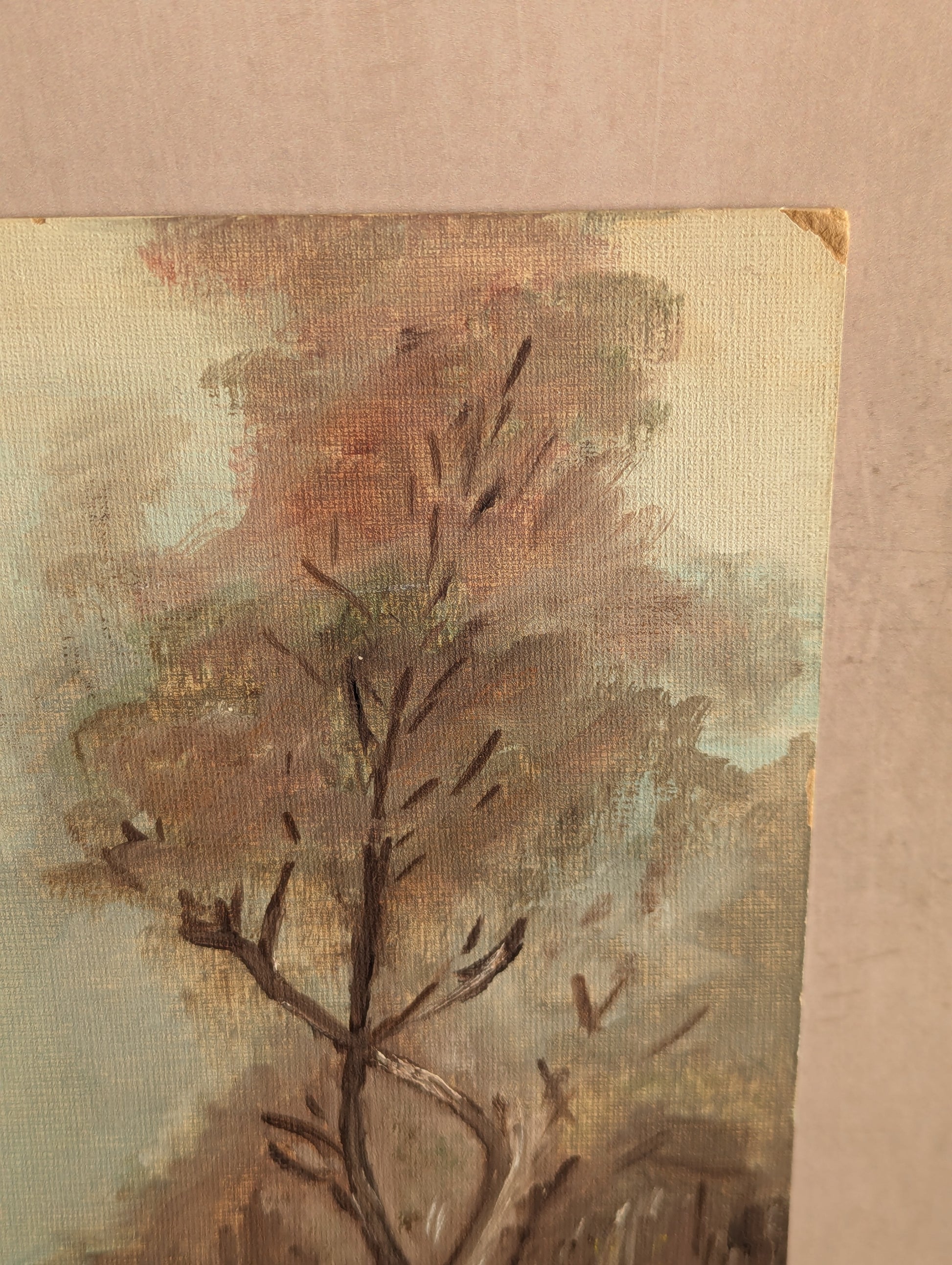 A landscape oil painting of trees along a river bank. Gentle pastels paired with natural tones that create a moody wintery feel. Discovered among a collection of paintings, some signed by "K.L. Cope." This piece is unsigned but believed to be by the same artist. No date to be found - likely vintage c. 1970s.