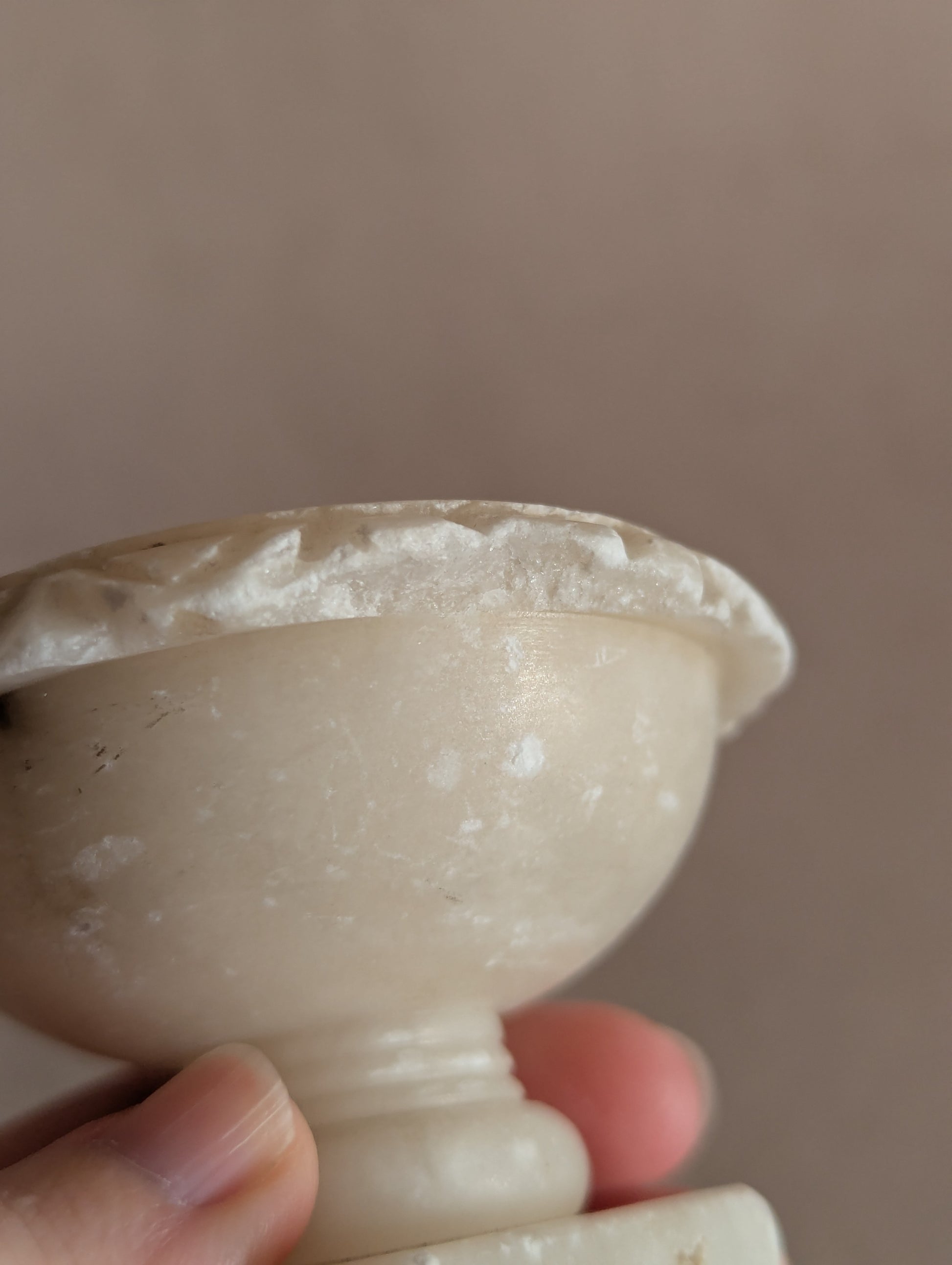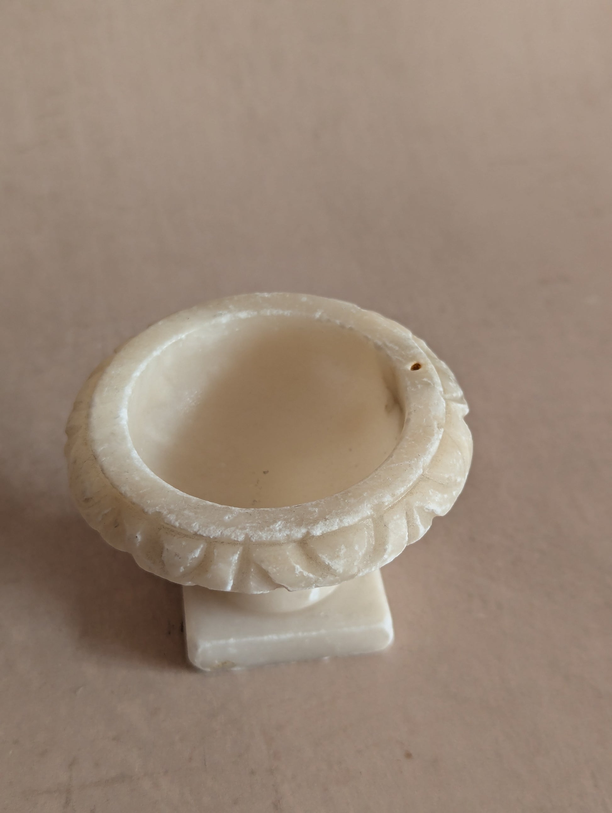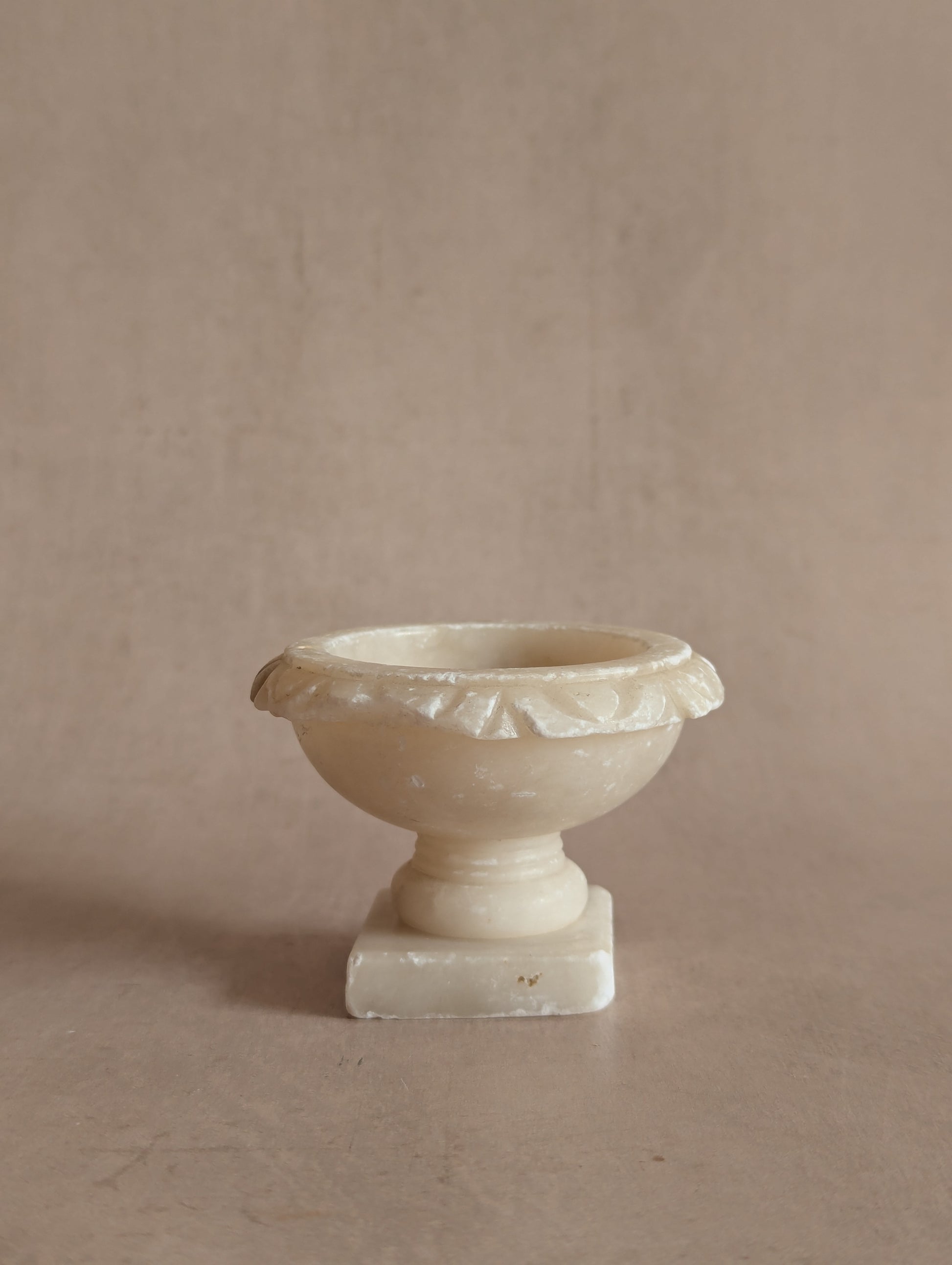 A beautiful small alabaster bird bath for one, without its bird. Snow white with weathered edges and the occasional smoky accent. Antique c. late 19th century. Measures 5cm tall, 7cm diameter.